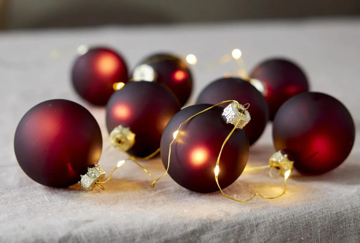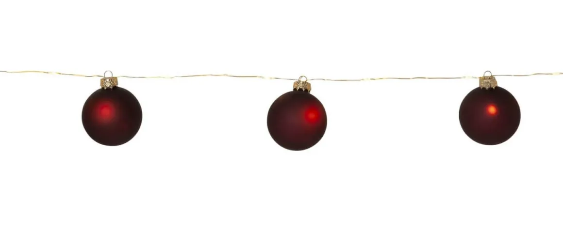 Vacker batteridriven ljusslinga med 8 st mörkt mattröda glaskulor från star trading. Den mässingsfärgade slingan lyser inte bara i kulorna utan även på slingan där emellan. Perfekt som bordsdekoration eller att hänga i den lilla bordsgranen. Slingan har självklart en timer så du enkelt själv kan ställa in när du vill att den ska lysa.