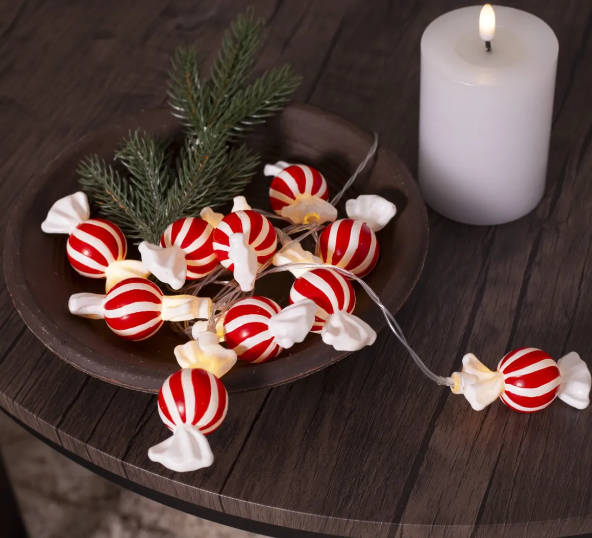 Härlig liten dekorationsslinga med små röd/vita karameller. Perfekt att dekorera med i ett blomsterarrangemang eller kanske på julbuffen. Drivs med 2 AA batterier och timer. Batterier ingår ej.