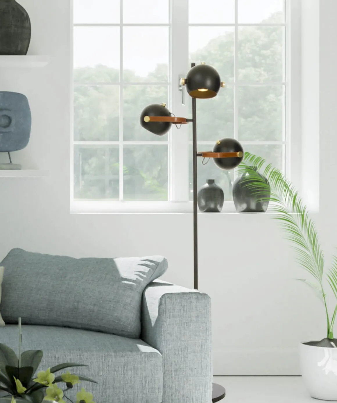 Vilken underbar serie lampor från Aneta. Kombinationen metall och läder ligger så rätt i tiden. Bow är inte bara en lampa- den är en del av din inredning som tål att synas. Här ser du golvlampan med 3 ställbara huvuden i svart med brunt läder och detaljer i mässing.