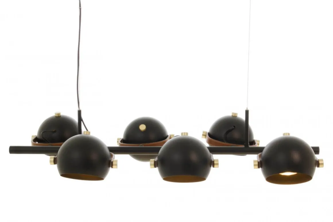 Vilken underbar serie lampor från Aneta. Kombinationen metall och läder ligger så rätt i tiden. Bow är inte bara en lampa – den är en del av din inredning som tål att synas. Här ser du takpendeln i svart med hela 6 stycken riktbara ljuskällor med brunt läder och detaljer i mässing. Givetvis med krokupphäng för en snabb och smidig installation.