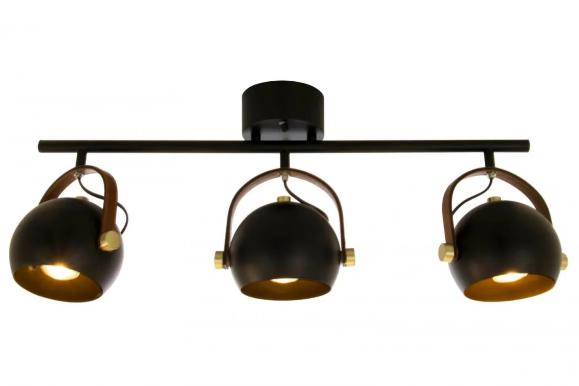Vilken underbar serie lampor från Aneta. Kombinationen metall och läder ligger så rätt i tiden. Bow är inte bara en lampa – den är en del av din inredning som tål att synas. Här ser du Bow takspot med 3 riktbara huvuden i svart med brunt läder och detaljer i mässing. Givetvis med krokupphäng för en snabb och smidig installation.