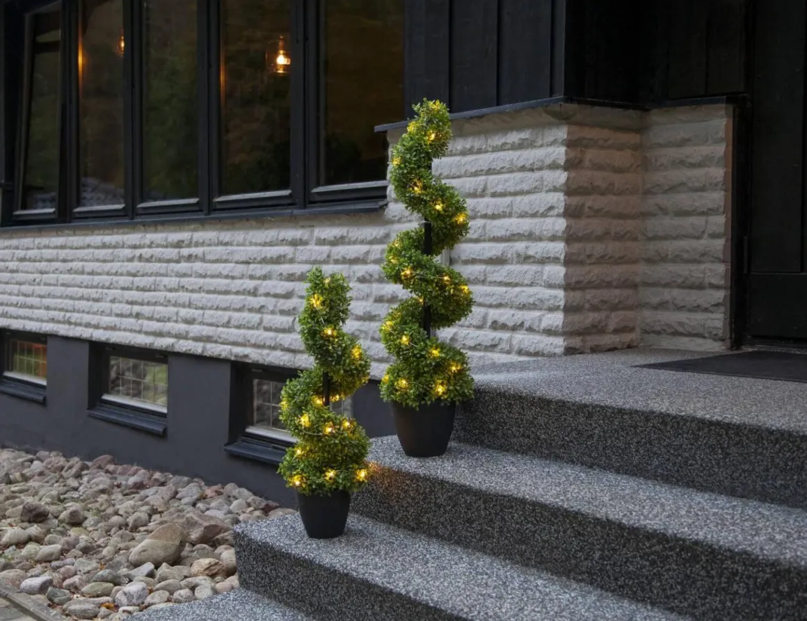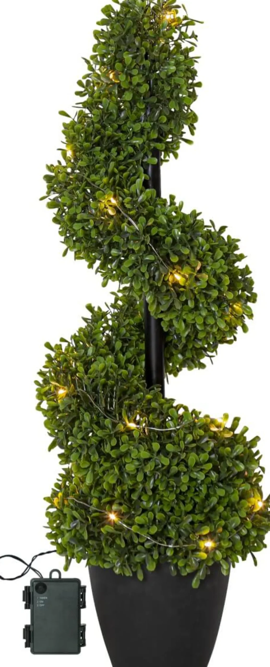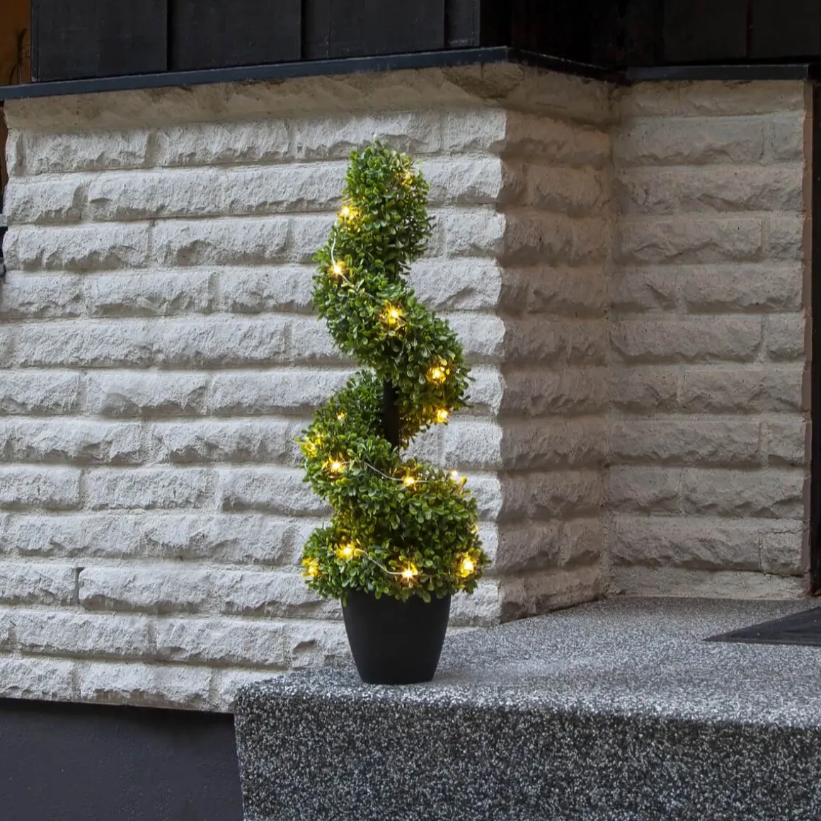 Vacker lysande Buxbom spiral med inbyggda lampor från Star Trading. Buxbom är gjord av PE plast och har 20 stycken varmvita små ljuskällor jämt fördelade i underverket. Buxbom drivs med batteri och har självklart en timer funktion så du enkelt själv kan ställa in när du vill att den ska lysa. Perfekt att ha utanför dörren eller kanske i en inbjudande hall eller lobby. Buxbom finns i 2 storlekar, här ser du den lilla med en höjd på 65 cm.