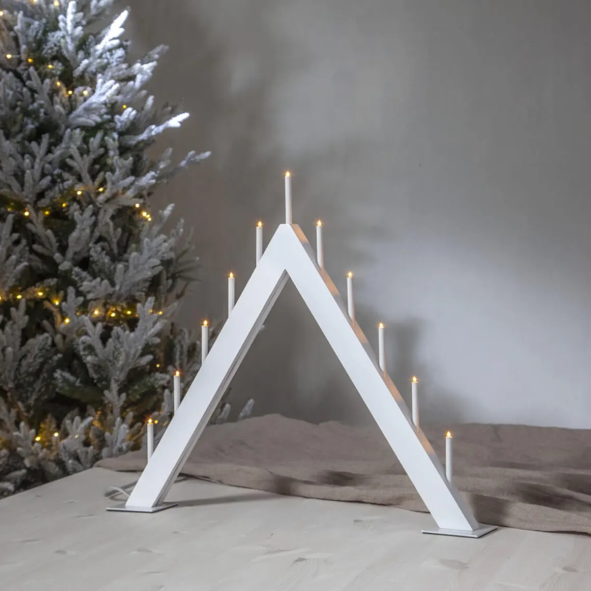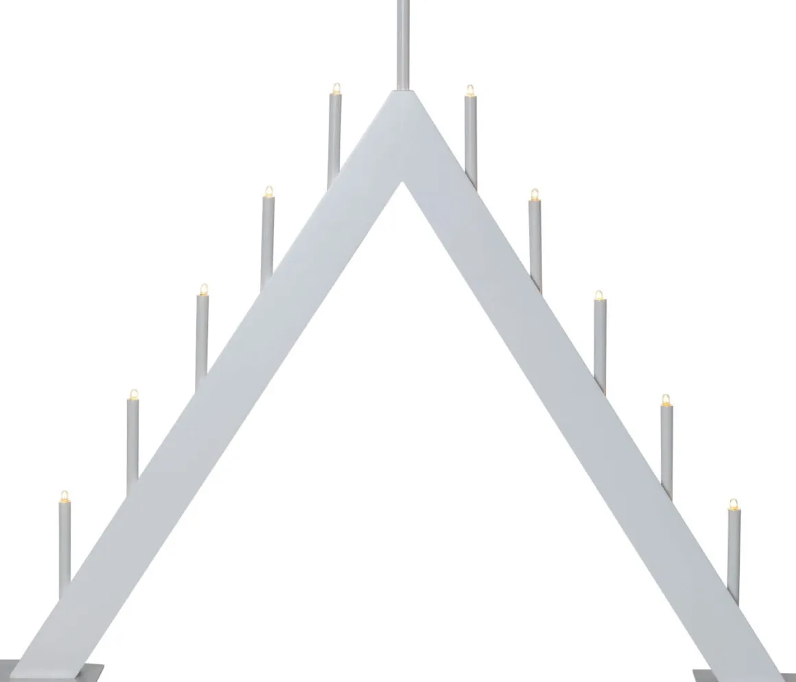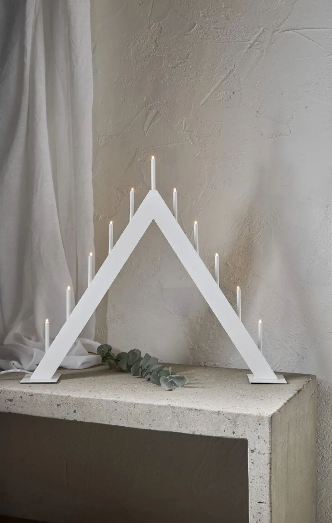 Stilren adventsljusstake med klassisk form i ny design, tillverkad i trä med ljuspipor av tunna metallrör. 11 stycken ljuskällor av modellen E5. Hela ljusstaken är målad i vitt. Textilkabel i vitt/grå. Ger ett härligt stämningsfullt ljus året runt..