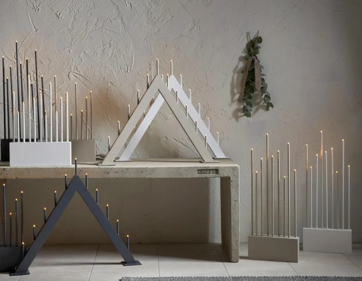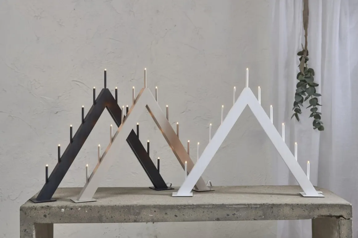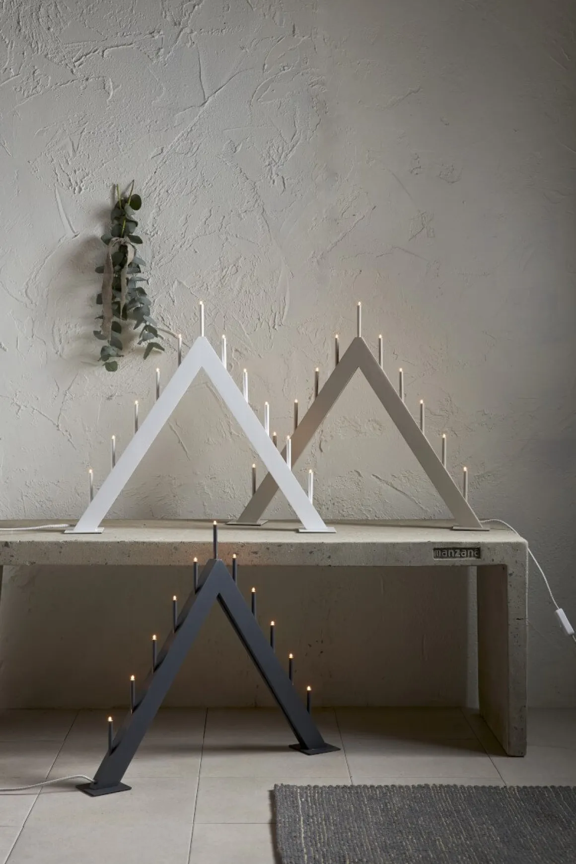 Stilren adventsljusstake med klassisk form i ny design, tillverkad i trä med ljuspipor av tunna metallrör. 11 stycken ljuskällor av modellen E5. Hela ljusstaken är målad i vitt. Textilkabel i vitt/grå. Ger ett härligt stämningsfullt ljus året runt..