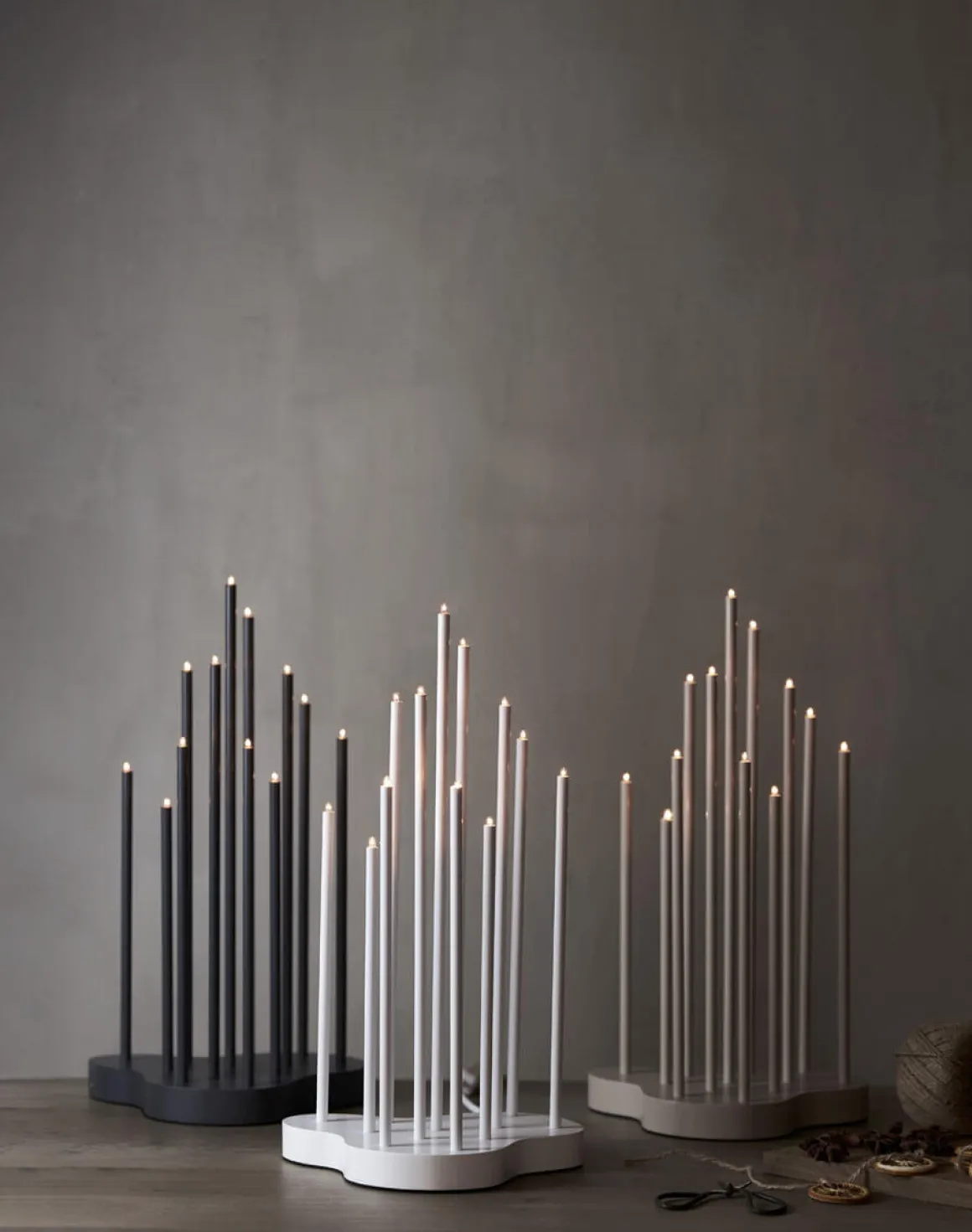Vi har stor efterfrågan på denna typen av ljusstakar så håll till godo med denna vackra nyheten från Star Trading i färgen elephant (beige). Stilren ljusstake med kraftig bas i trä, ljuspipor av tunna metallrör. 12 stycken små E5 ljuskällor. Hela ljusstaken i grafitgrå färg – enhetligt och snyggt. Textilkabel i vitt/grå adderar lite extra lyx. Ger ett härligt stämningsfullt mysigt ljus hela året runt.