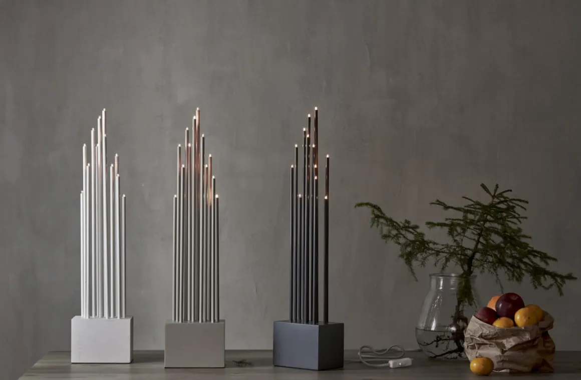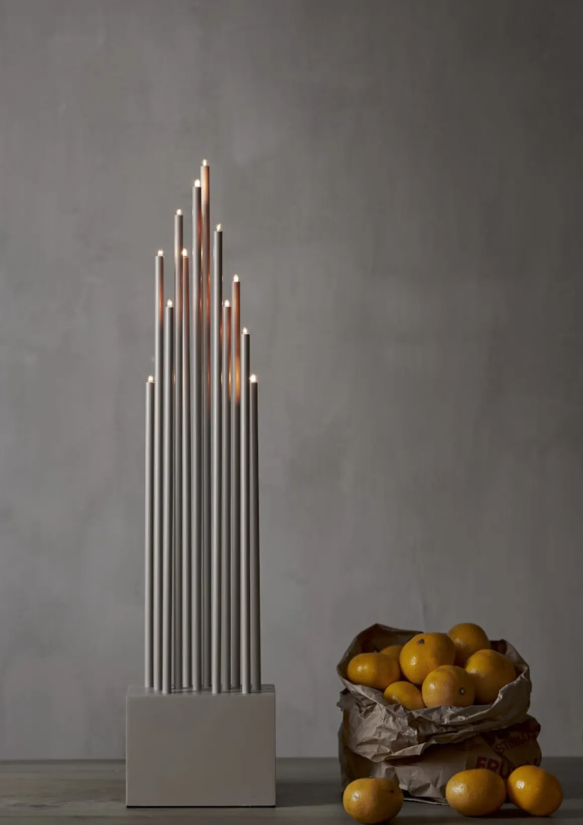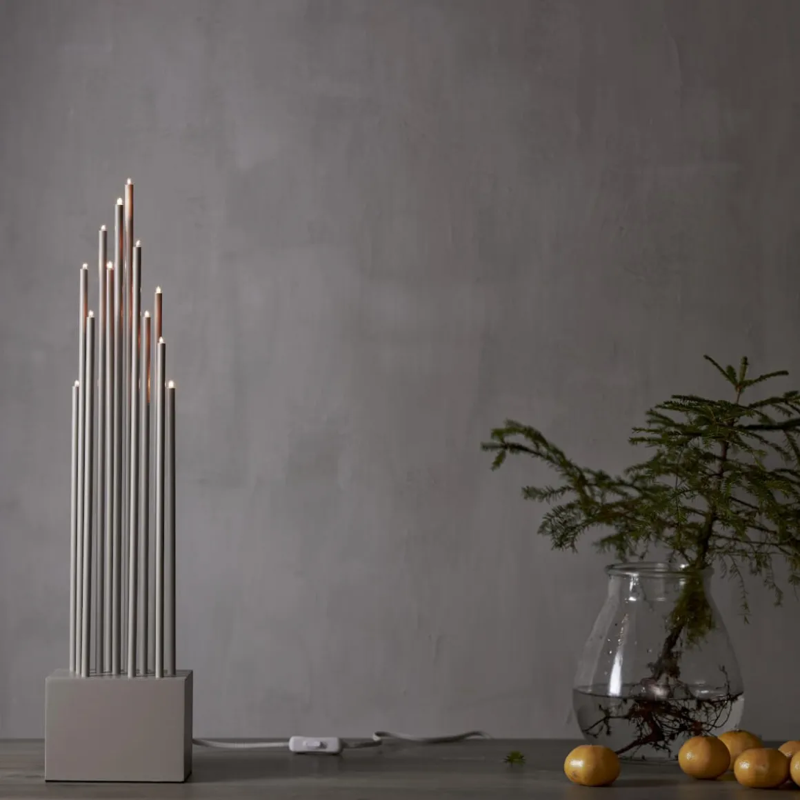 Vi har stor efterfrågan på denna typen av ljusstakar så håll till godo med denna vackra nyheten från Star Trading. Stilren ljusstake på 65 centimeter med kraftig bas i trä, ljuspipor av tunna metallrör. 12 stycken små E5 ljuskällor. Hela ljusstaken i beige färg – enhetligt och snyggt. Textilkabel i vitt/grå adderar lite extra lyx. Ger ett härligt stämningsfullt mysigt ljus hela året runt.