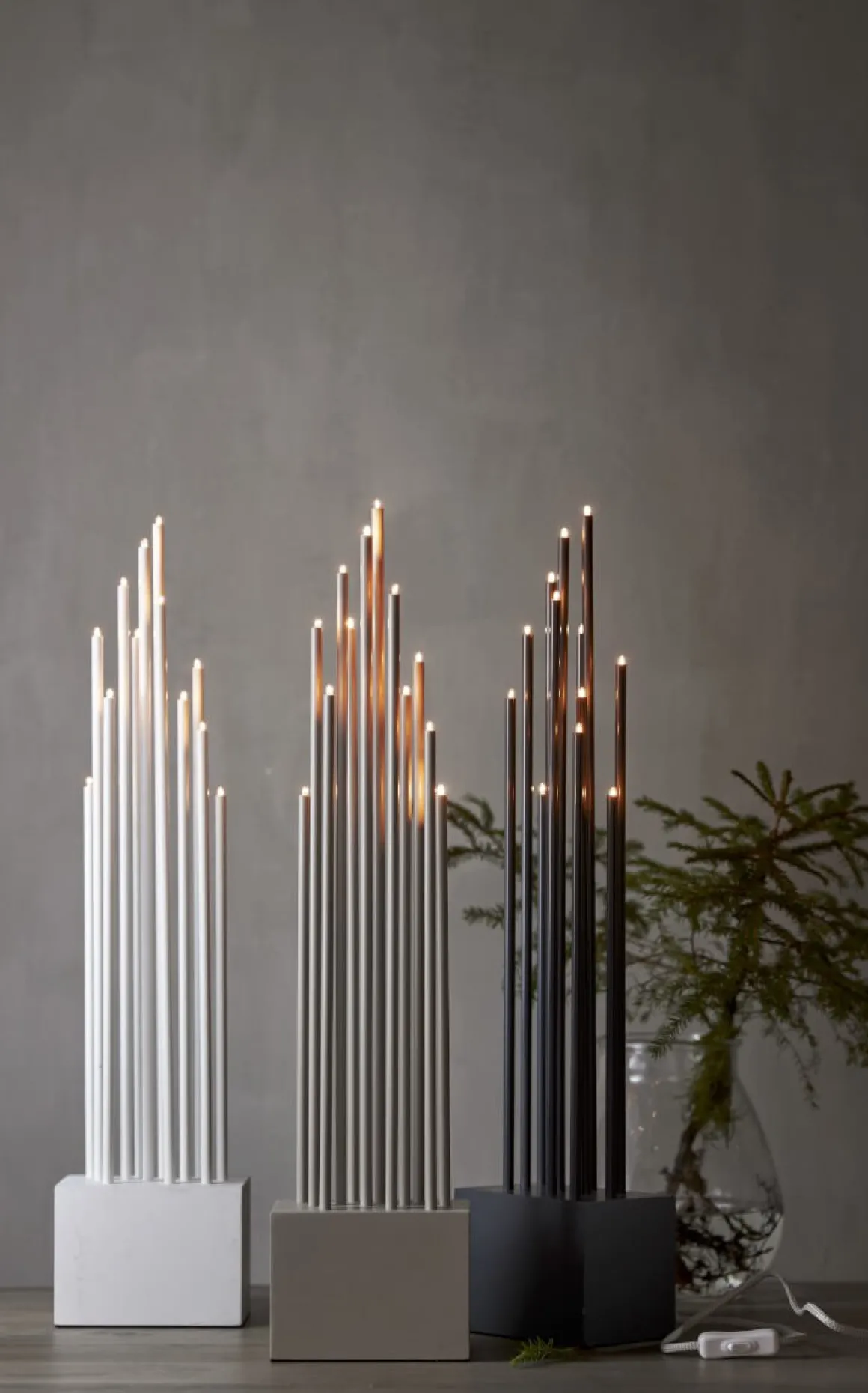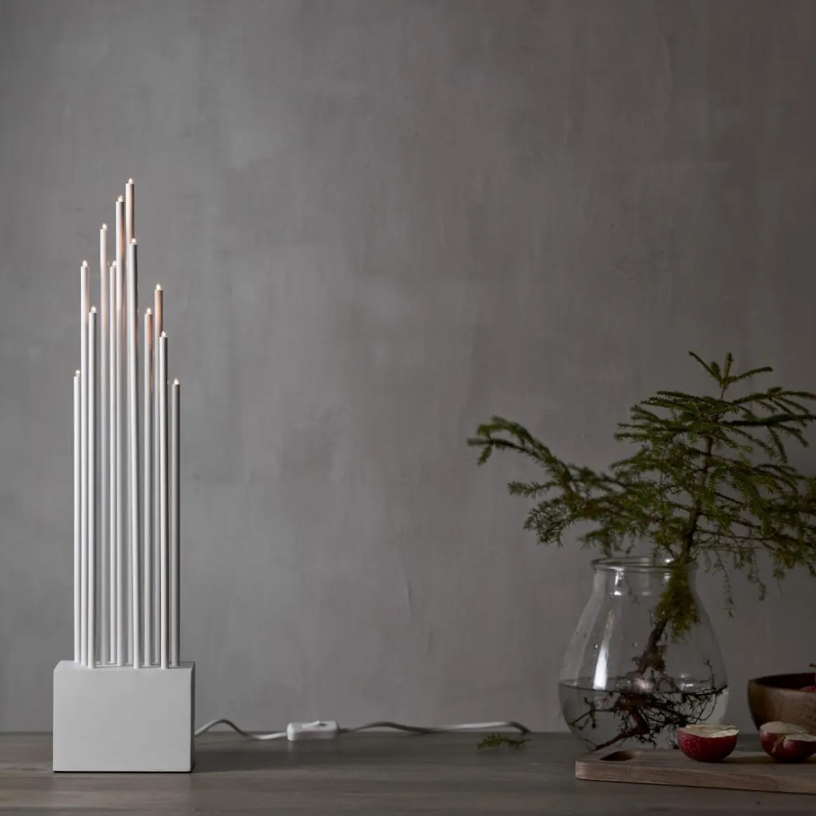 Vi har stor efterfrågan på denna typen av ljusstakar så håll till godo med denna vackra nyheten från Star Trading. Stilren ljusstake på 65 centimeter med kraftig bas i trä, ljuspipor av tunna metallrör. 12 stycken små E5 ljuskällor. Hela ljusstaken i vit färg – enhetligt och snyggt. Textilkabel i vitt/grå adderar lite extra lyx. Ger ett härligt stämningsfullt mysigt ljus hela året runt.