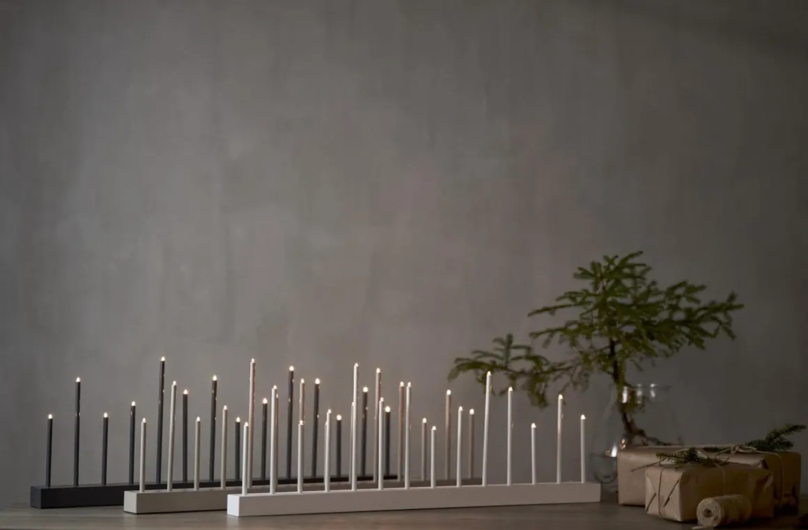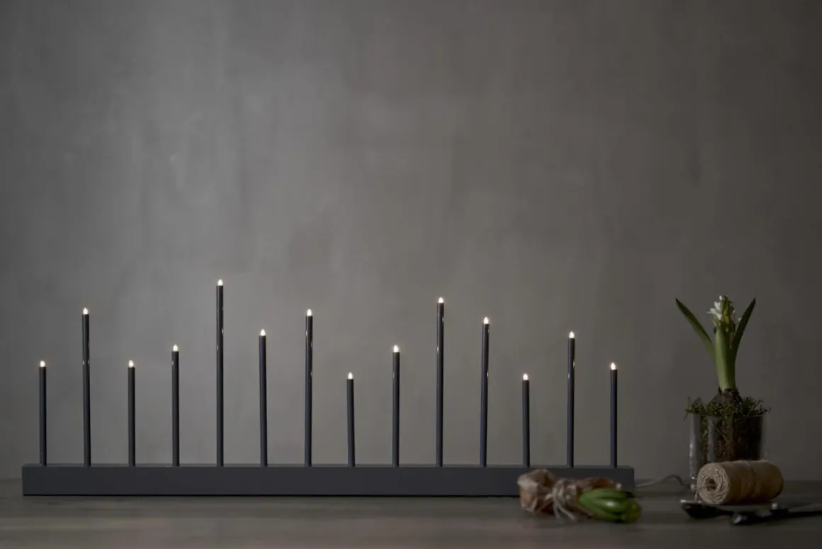 A ja ja och välkommen säger vi till denna härliga ljusstake från Star Trading. Buzz har en långsmal bas i trä med 14 stycken små E5 lampor. Buzz passar lika bra i ett långsmalt fönster som i en bokhylla eller varför inte på tv-bänken? Här ser du Buzz i grafitgrått.