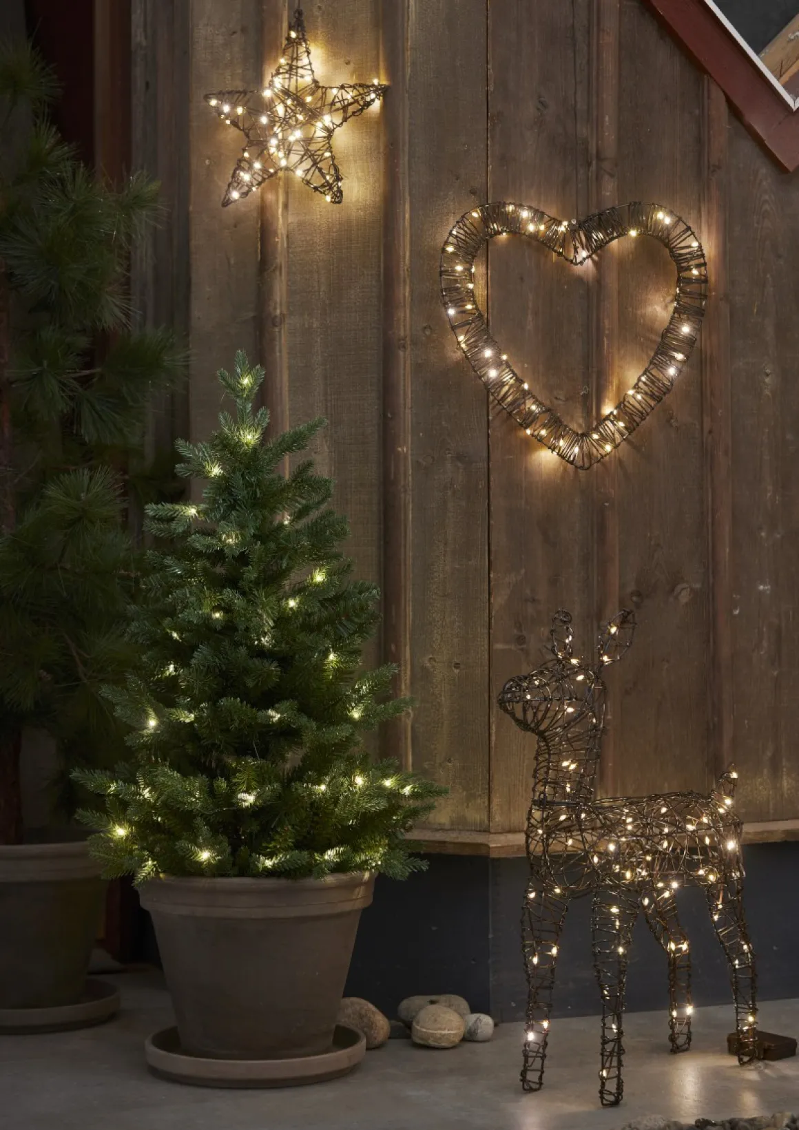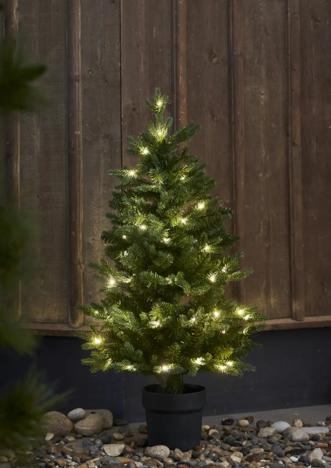 Vacker liten gran i kruka färdig att ställa fram, drivs gör den med batteri och har en inbyggd timer. Godkänd för både inomhus och utomhusbruk.