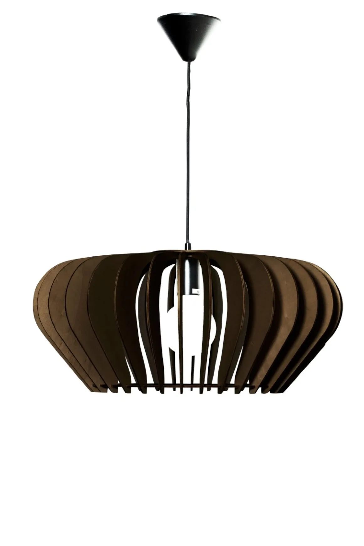 Calyps taklampa i rundade plywoodlameller ger vacker ljus-skuggeffekt. Elegant design för bra allmänljus över köksbord eller i vardagsrum – tidlös & dekorativ!