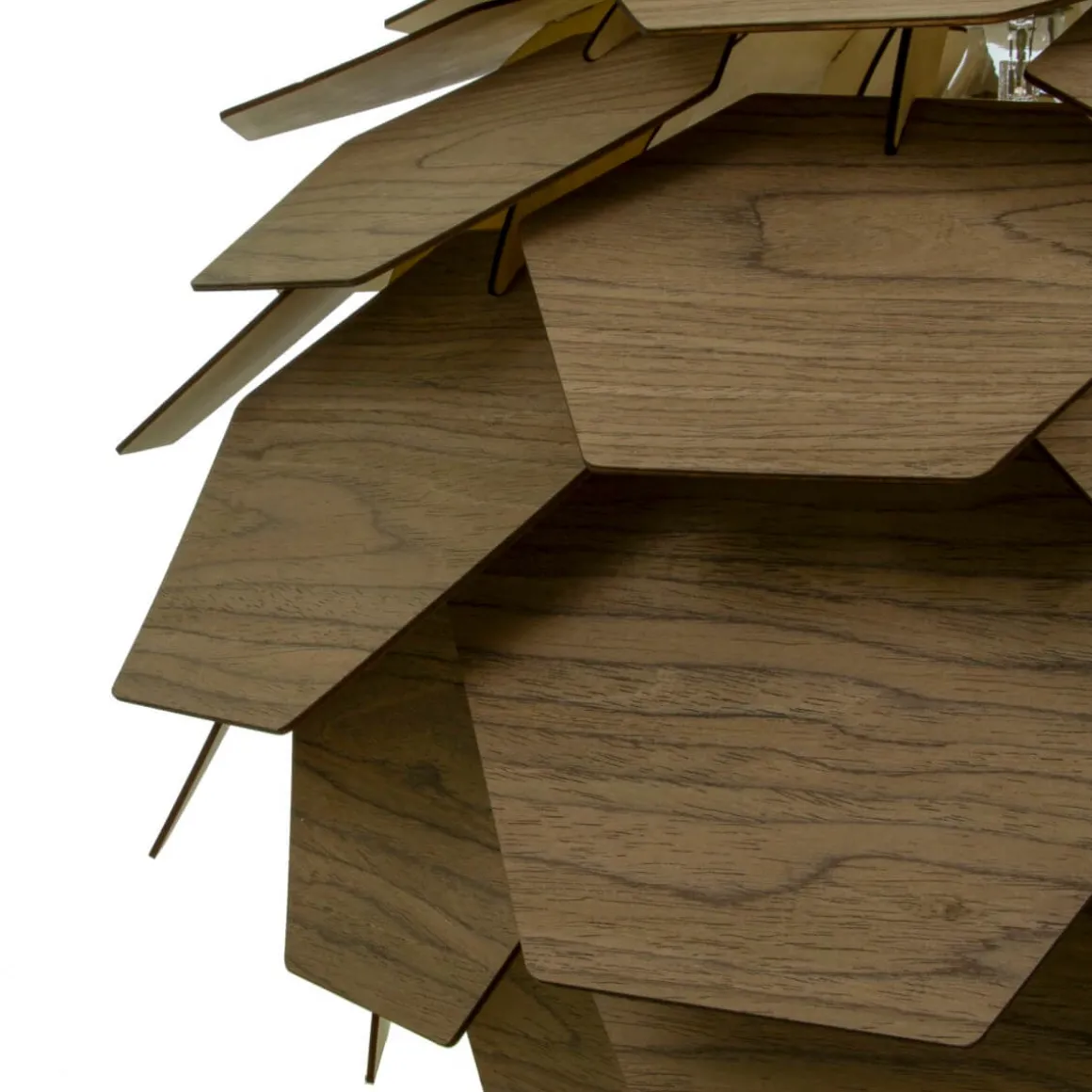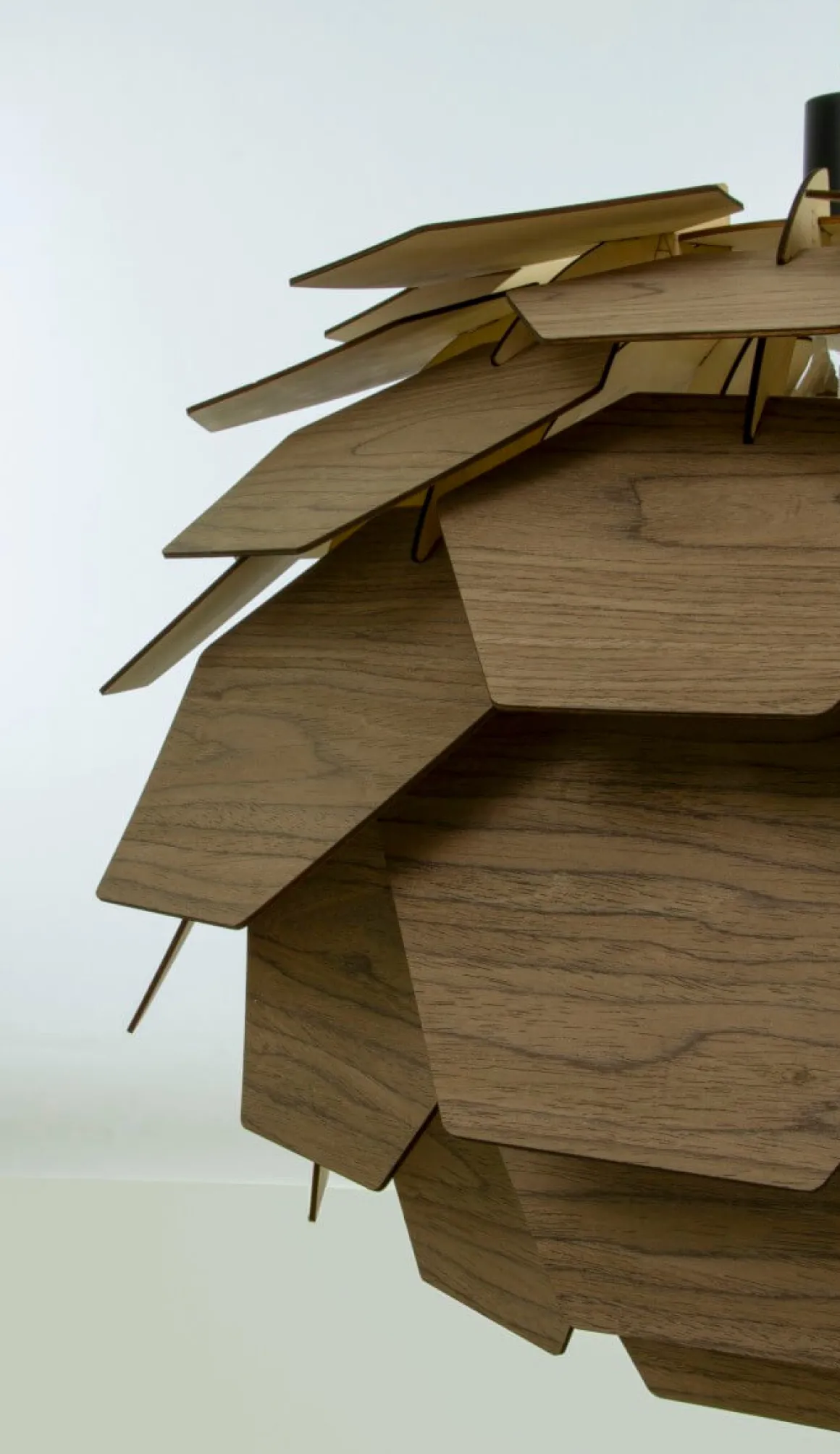 Vackra Carpatica taklampa, med flera lager av trälameller med brunbetsad faner, har en design som påminner om en rund kotte. Lampan ger ett dämpat, väldigt trivsamt ljus som är perfekt i vardagsrummet eller över matbordet. Carpatica levereras i ett platt paket så du monterar själv ihop lampan i några enkla steg. Svart takkopp med krokupphäng för snabb och smidig installation.