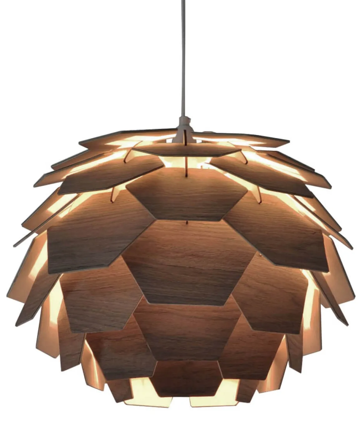 Wow, så läcker taklampa av brunbetsad träfaner från Aneta belysning som ger ett mjukt ljus med härliga skuggor. Carpatica är enkelt att montera på en takkrok precis så som det ska va.