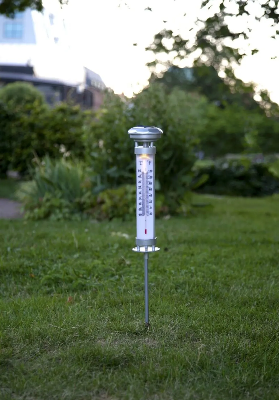 Termometer med belysning som lyser med ett varmt och behagligt sken under natten. Det finns både Celsius och Fahrenheit skala på mätaren.