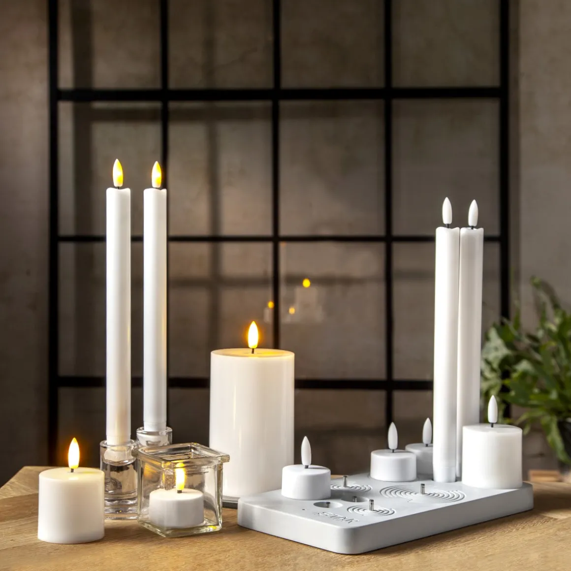 Flamme Charge är ett set med ljus i olika storlek som är uppladdningsbara från Star Trading. I setet ingår: 4st värmeljus 4x5cm, 4st antikljus 2x26cm, 2st votivljus 5x8cm och 1st blockljus 7,5x15cm. Den tillhörande laddningsplattan har även en medföljande 80cm lång kabel med USB A-USB C kopplingar som enkelt går att kopplas in i en 5V adapter, adaptern ingår inte. Indikationslampan i varje ljus lyser röd under laddning och grön när ljuset är färdigladdad. Även om litium batterierna har överladdningsskydd så Låt EJ ljusen ladda längre än 5 timmar max! När de är nya räcker det med en laddning på max 2 timmar.