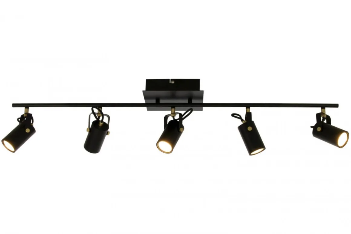 Takspot från Aneta belysning med 5 riktbara armar. Härlig kombination av svart och mattmässing.