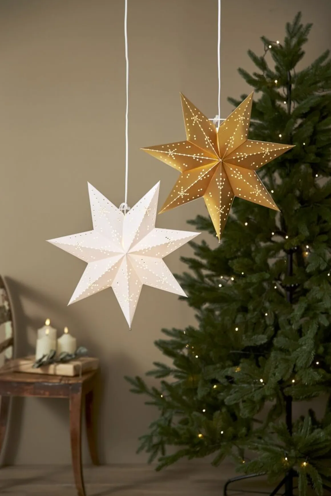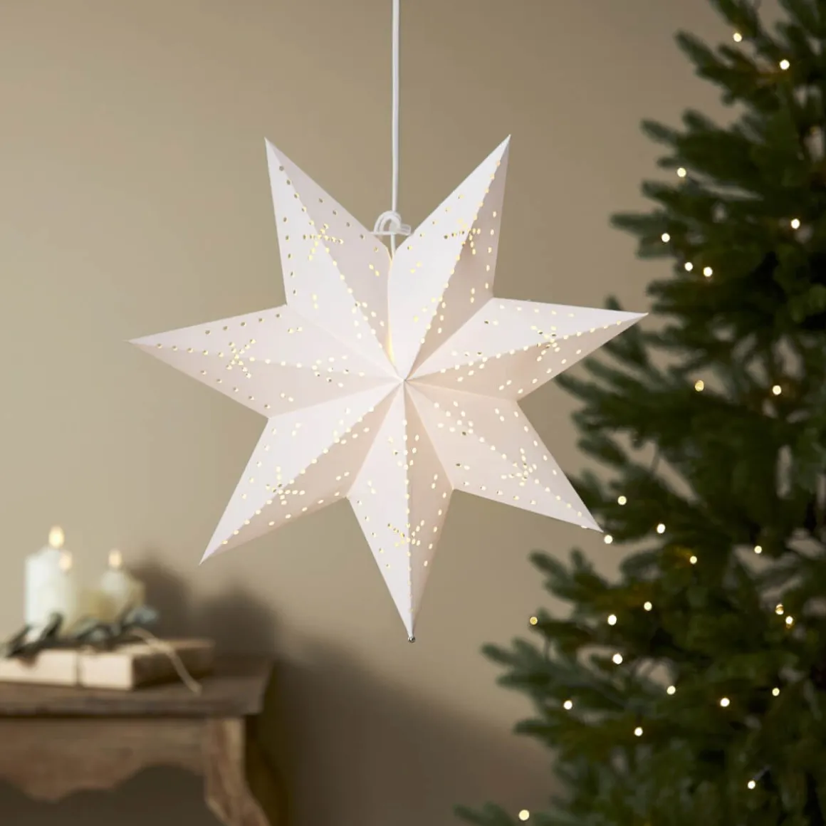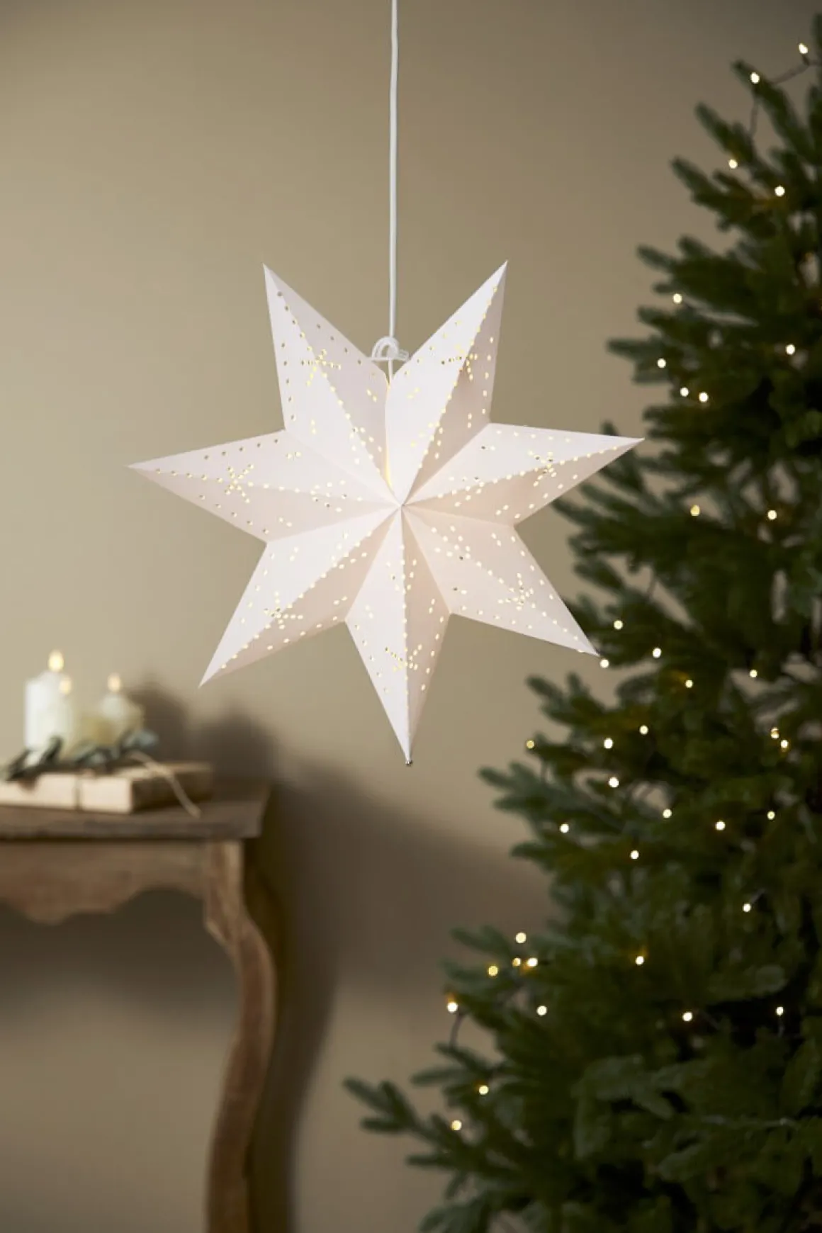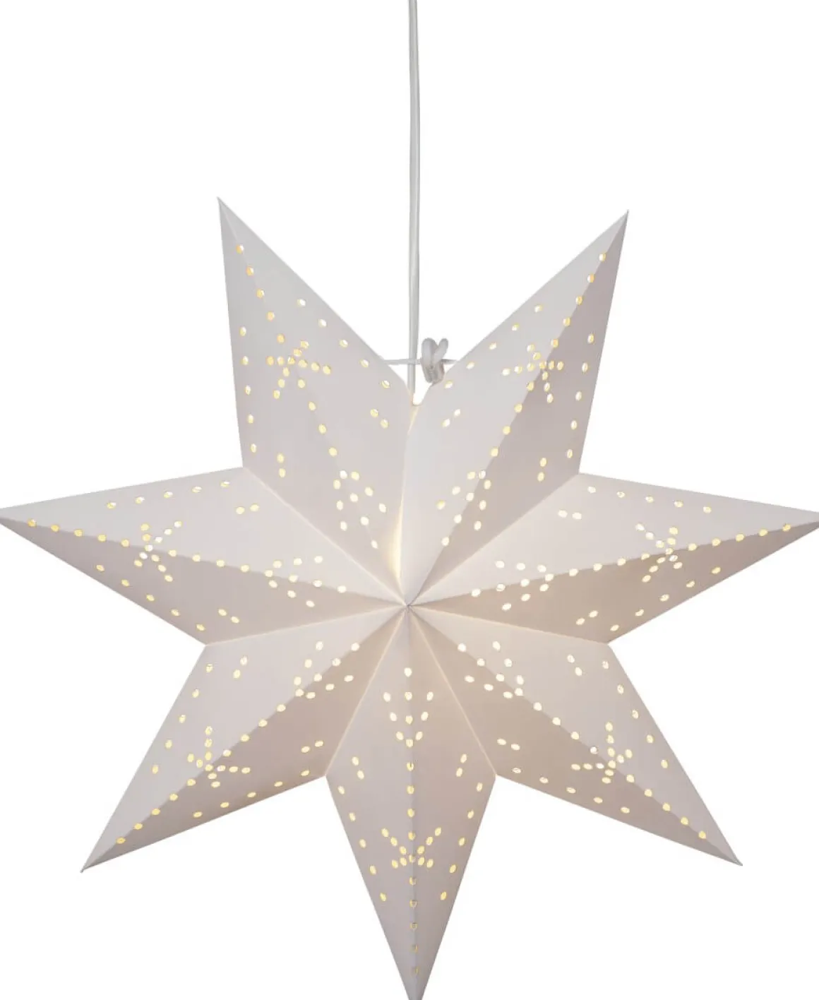 Dekorativ adventsstjärna i papper som påminner om den klassiska modellen i metall med ett stansat hålmönster som släpper igenom ett stämningsfullt ljus. Sladdställ med E14 lamphållare ingår.Dekorera till advent och jul, passar utmärkt i ett fönster eller mot en vägg för den perfekta julkänslan.