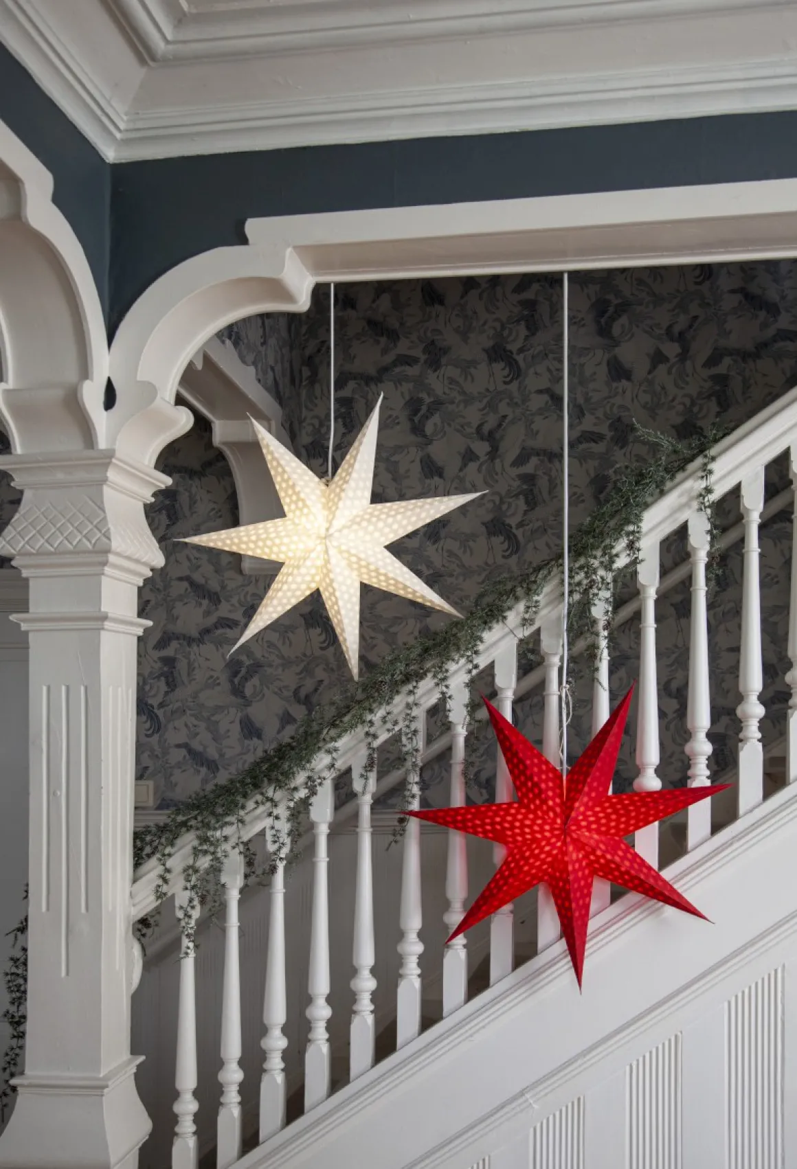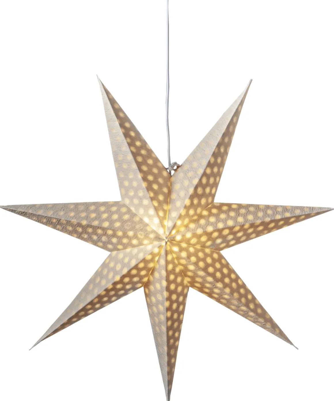 Magisk vit adventsstjärna från Star Trading som är tillverkad av papper från återvunnet bomullsspill från t-shirt tillverkning. Vattenstämplat mönster i form av prickar. Stjärnan sprider stämning och ger hemmet den där speciella advent och julkänslan. Kan hängas både i fönster och mot en vägg. (sladdställ köpes separat)