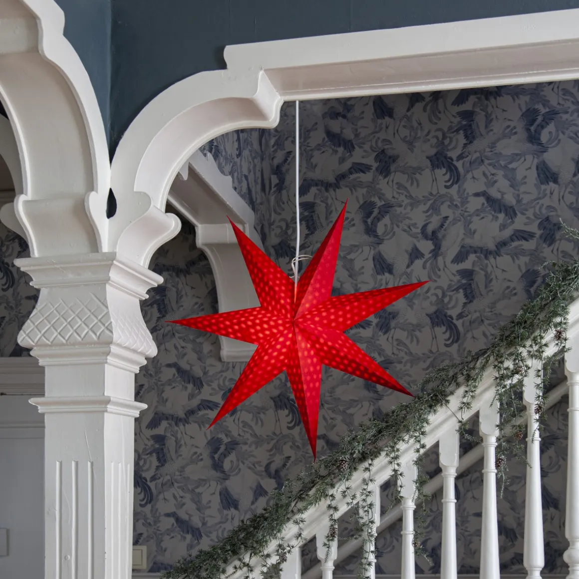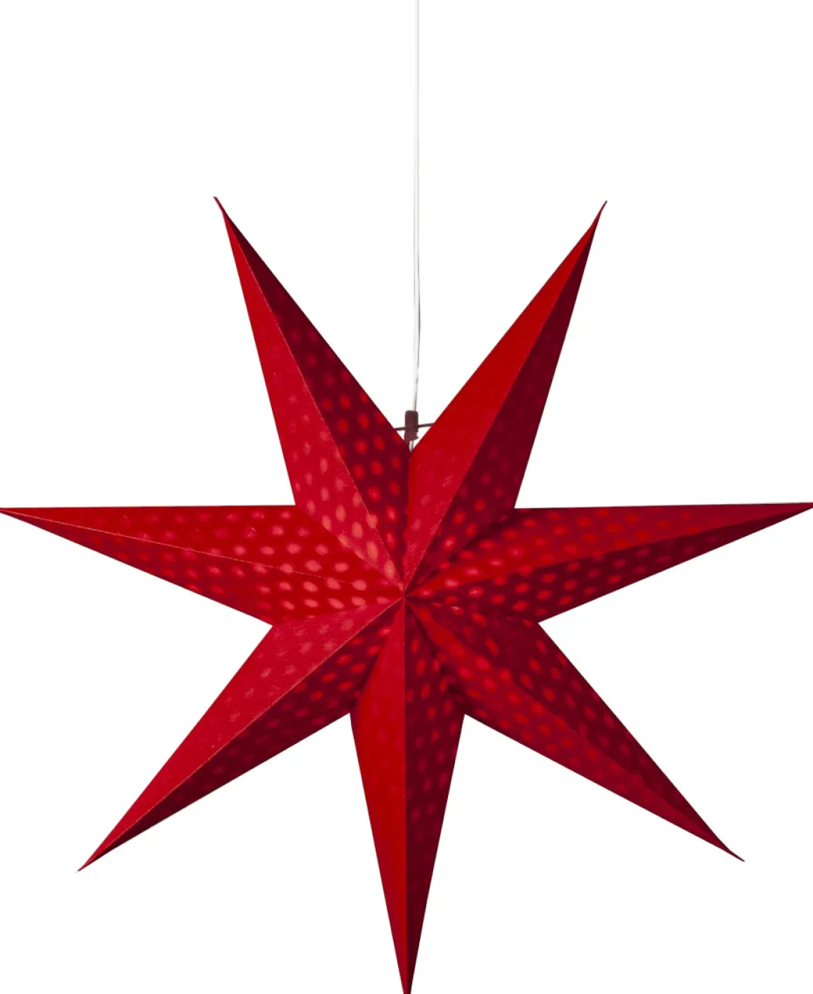 Magisk adventsstjärna som är tillverkad av papper från återvunnet bomullsspill från t-shirt tillverkning. Vattenstämplat mönster i form av prickar lyser genom pappret. Stjärnan sprider stämning och ger hemmet den där speciella advent och julkänslan. Kan hängas både i fönster och mot en vägg. Sladdställ ingår ej
