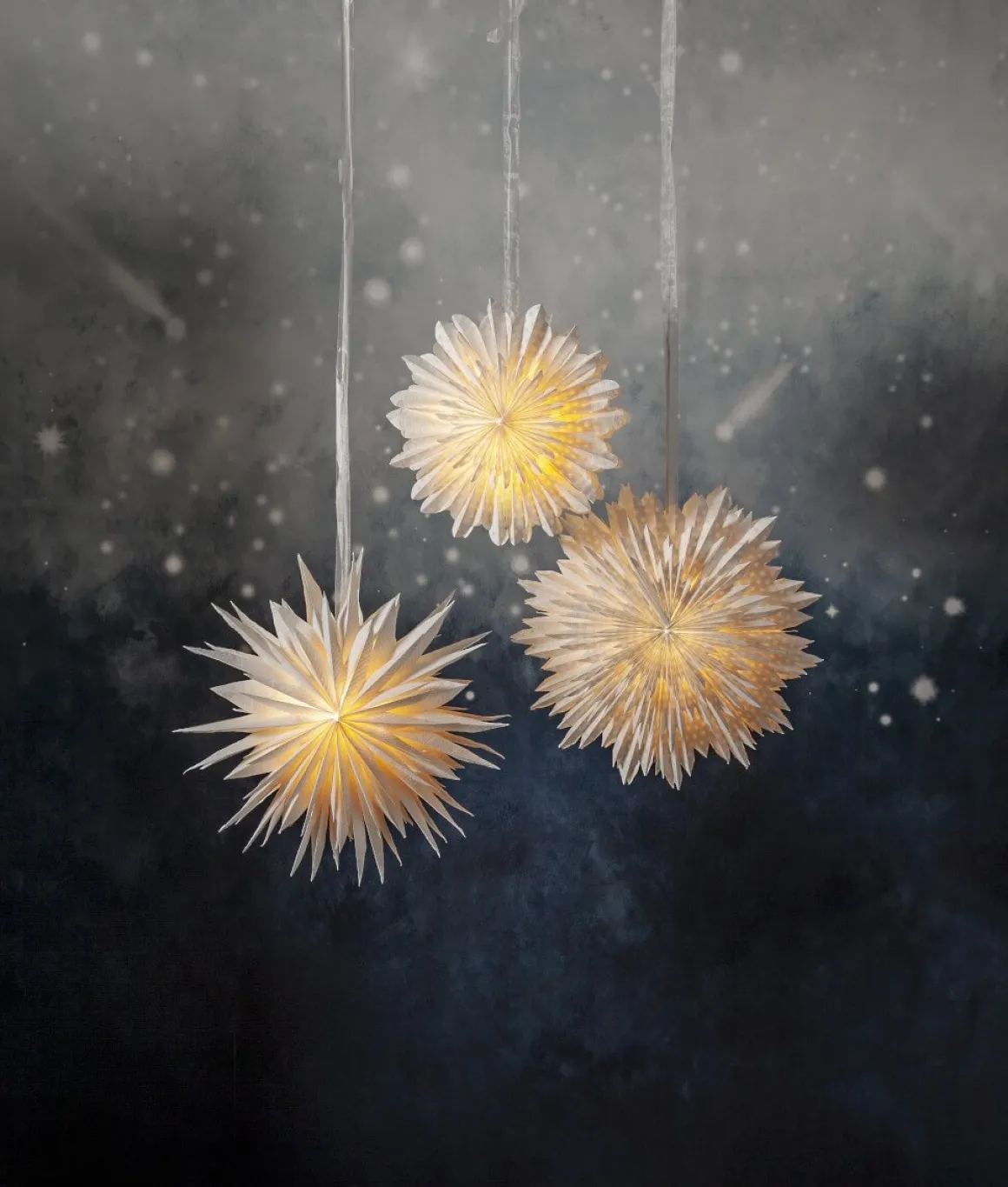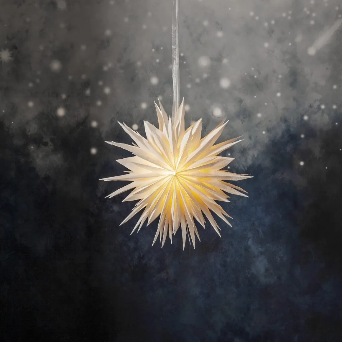 Underbart vacker pappersstjärna som är tillverkad av två lager veckat papper från Star Trading. Pappret är tillverkat av återvunnen bomullsspill från t-shirt tillverkning. Strukturen i pappret blir därför mjukt och i själva pappret ser man vattenstämplade ränder. Konturen är flikig för en vintrigare känsla. Ett elegant band ingår för att lättare kunna hänga upp stjärnan. Stjärnan sprider stämning och ger hemmet den där speciella advent ochjulkänslan. Kan hängas både i fönster och mot en vägg. Sladdställ och ljuskälla köpes separat.