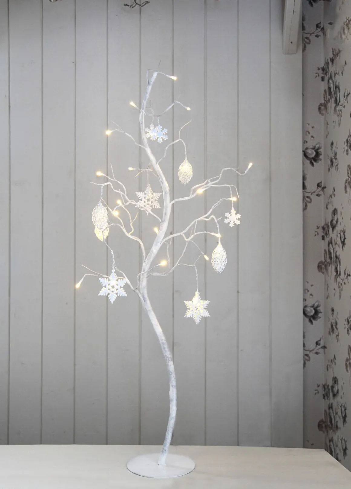 Vitt dekorationsträd med fina hängande metalldetaljer från Star Trading. Trädet har 27 stycken små LED-ljuskällor som ger ett härligt varmvitt sken. Vacker dekoration att inreda med inomhus.