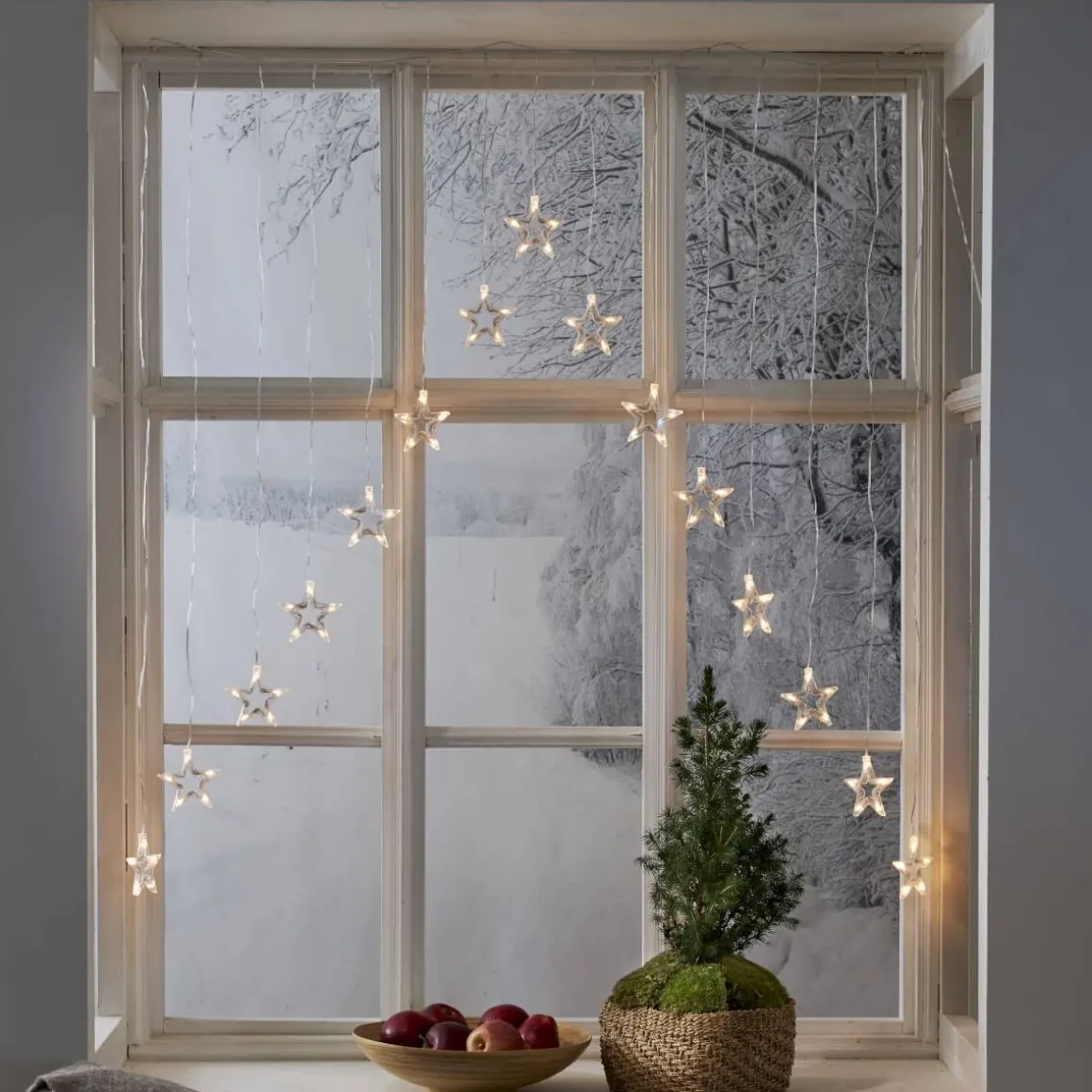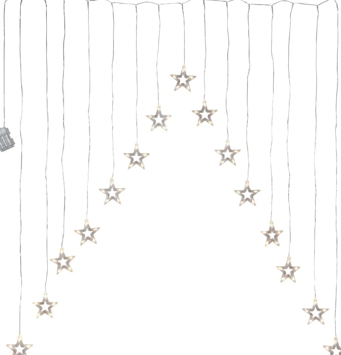Härlig ljusdekoration från välkända Star Trading med 15 stycken små ljusstjärnor som lyser med ett varmt och behagligt sken. Denna ljusgardin drivs med tre stycken AA batterier och har självklart en timer så du lätt kan ställa in när du vill att den ska lysa. (batterier ingår ej)
