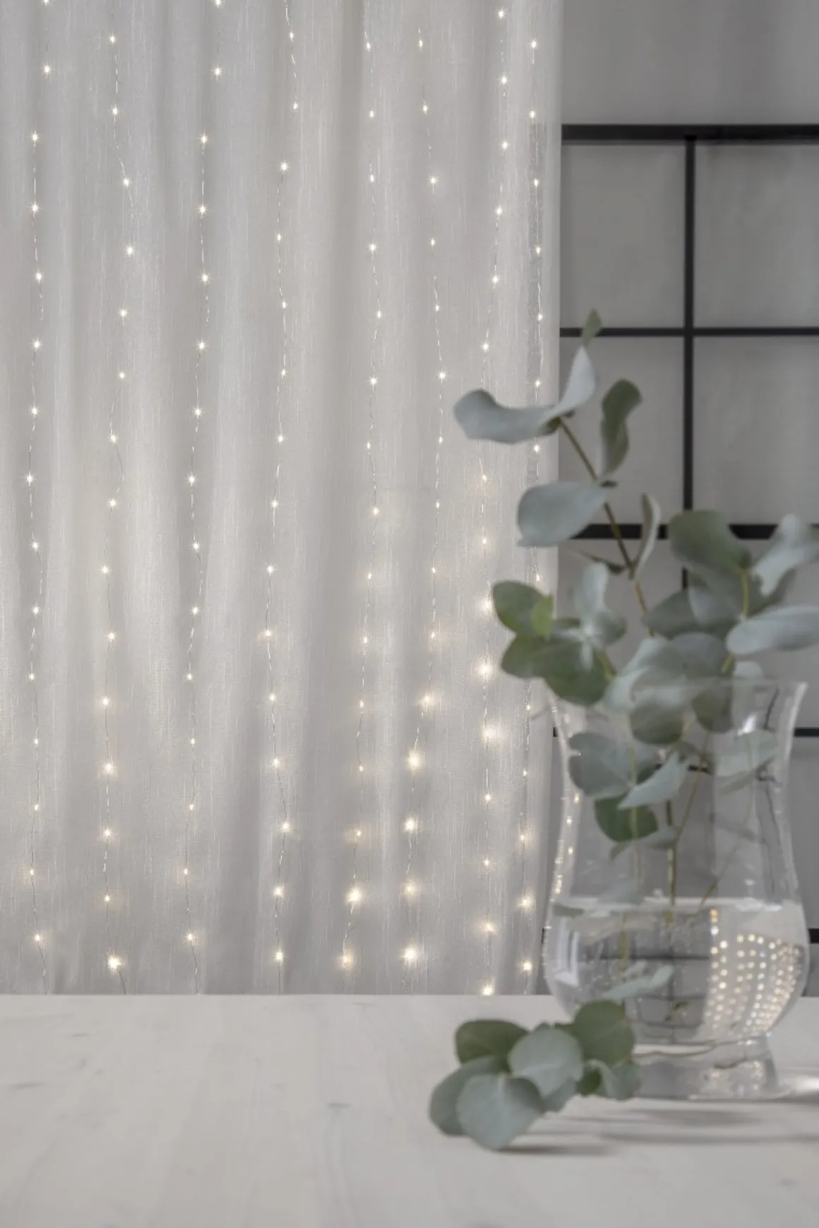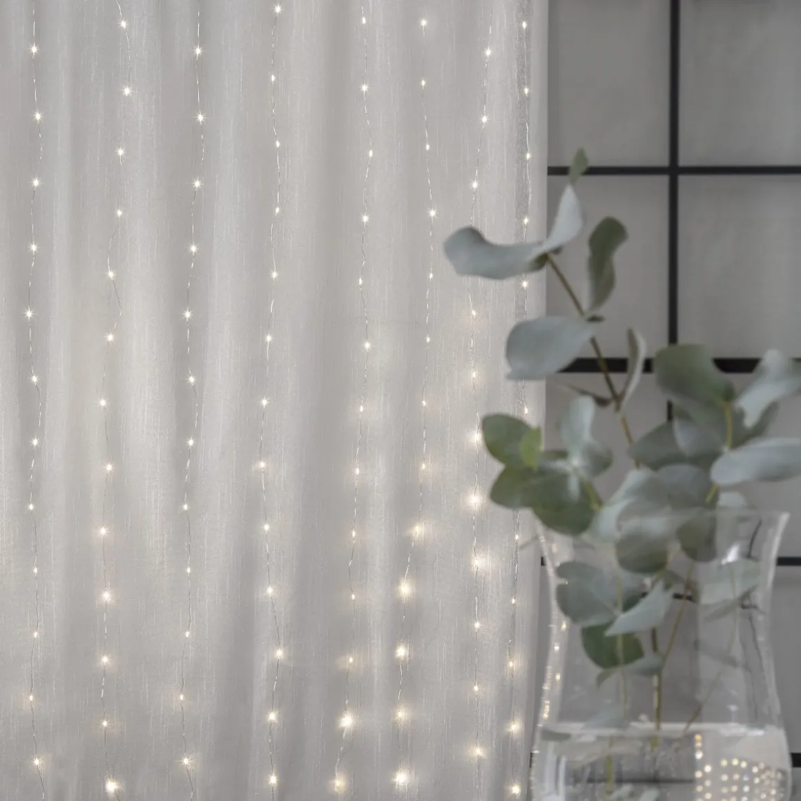 Underbar ljusgardin med populära dew drop för inomhusbruk. Ljusslingan har hela 200 varmvita LED-ljuskällor som avger ett vackert sken. Härlig dekoration att ha framme till vardags och fest. Gardin med 10 strängar, 1 meter bred och 2meter lång..