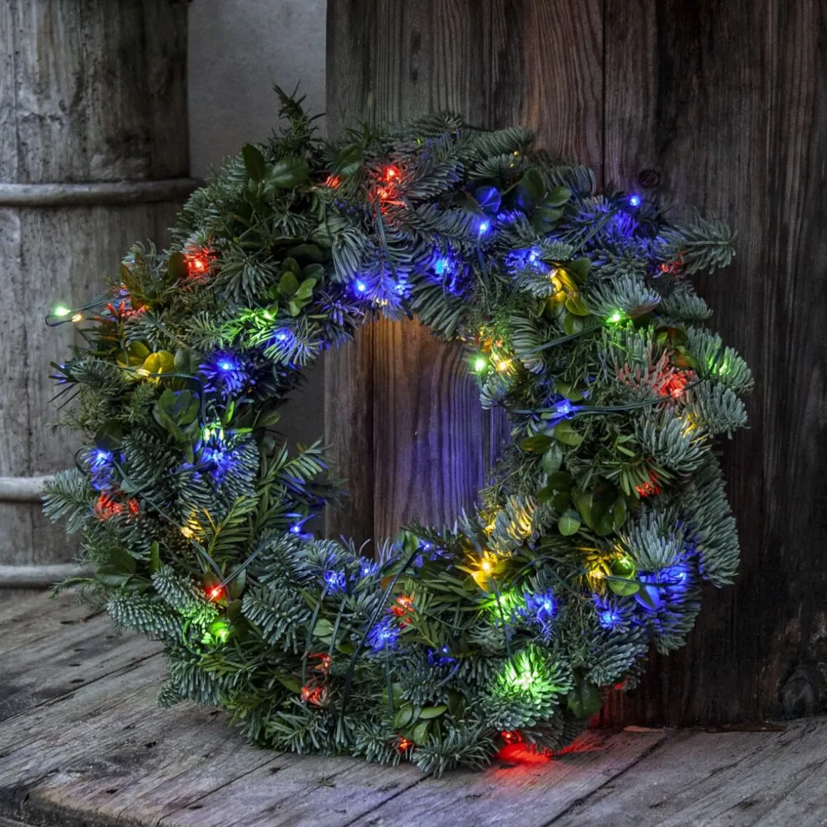 Tunn platt batteridriven slinga från Star Trading med små söta ljuspunkter för utomhusbruk, perfekt och enkel att använda i träd, buskar, kransar, trappräcken ja lite överallt. Denna ljusslingan har grön kabel med 96 multifärgade LED, 7,5cm mellan varje lampa ger en slinga på ca 7 meter. Batteribox med timerfunktion så att du lätt kan ställa in när du vill att den ska lysa och 8 olika blinksekvenser varav en självklart är med fast sken.