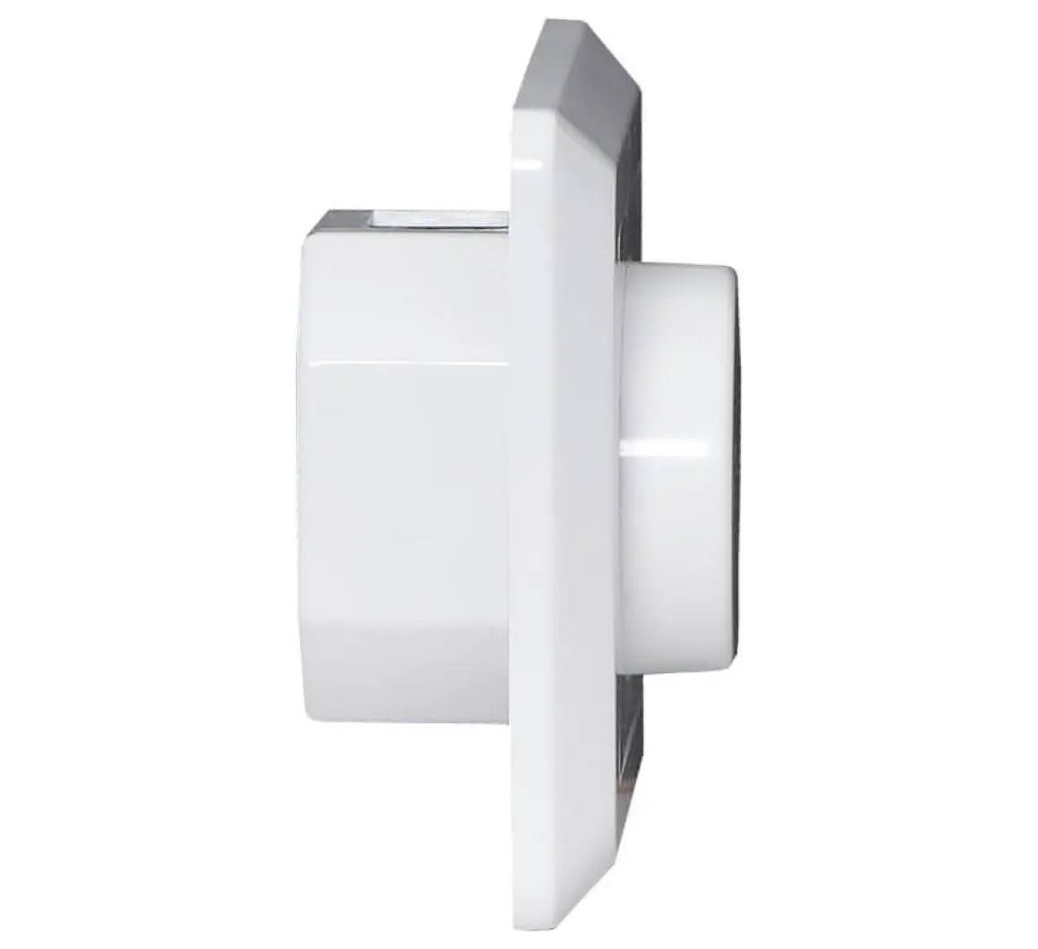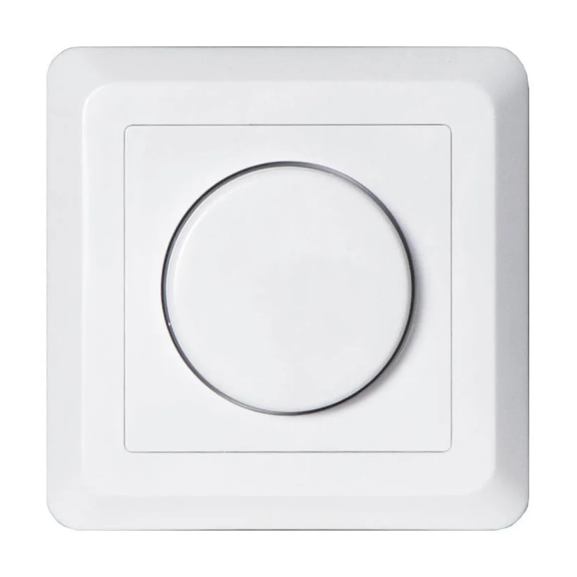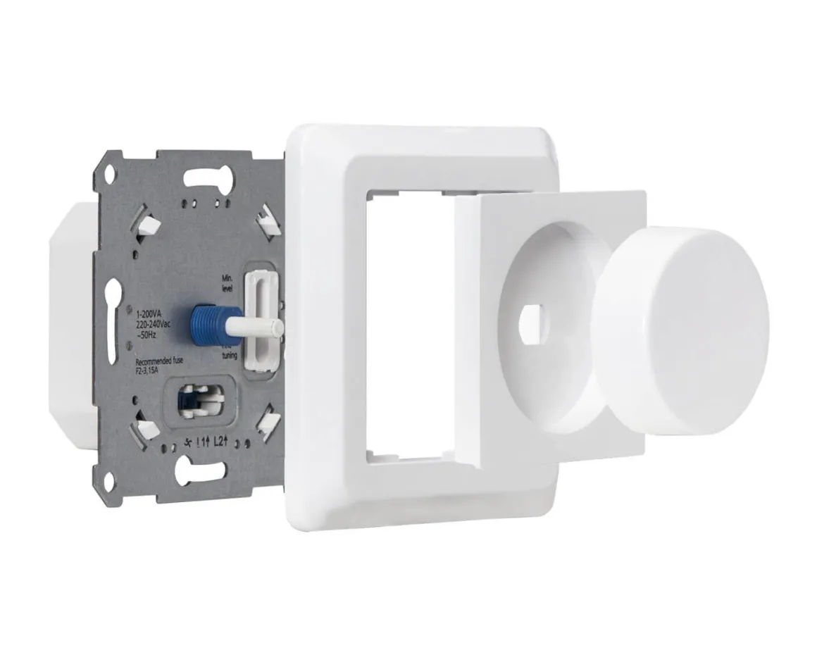 Vit väggdimmer från Star Trading för inomhusbruk, 0-200 VA. Vrid för att dimra, tryck för att slå på och av ljuset. Ny förbättrad design för att passa i fler installationer!