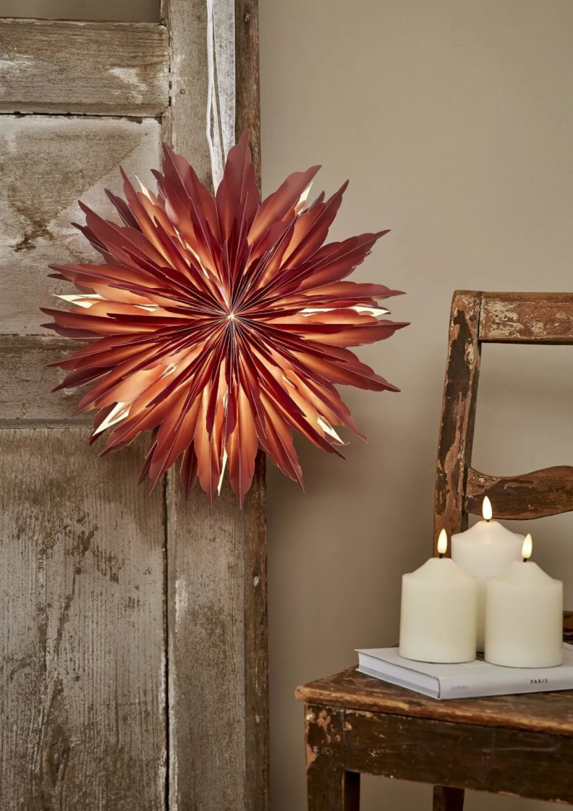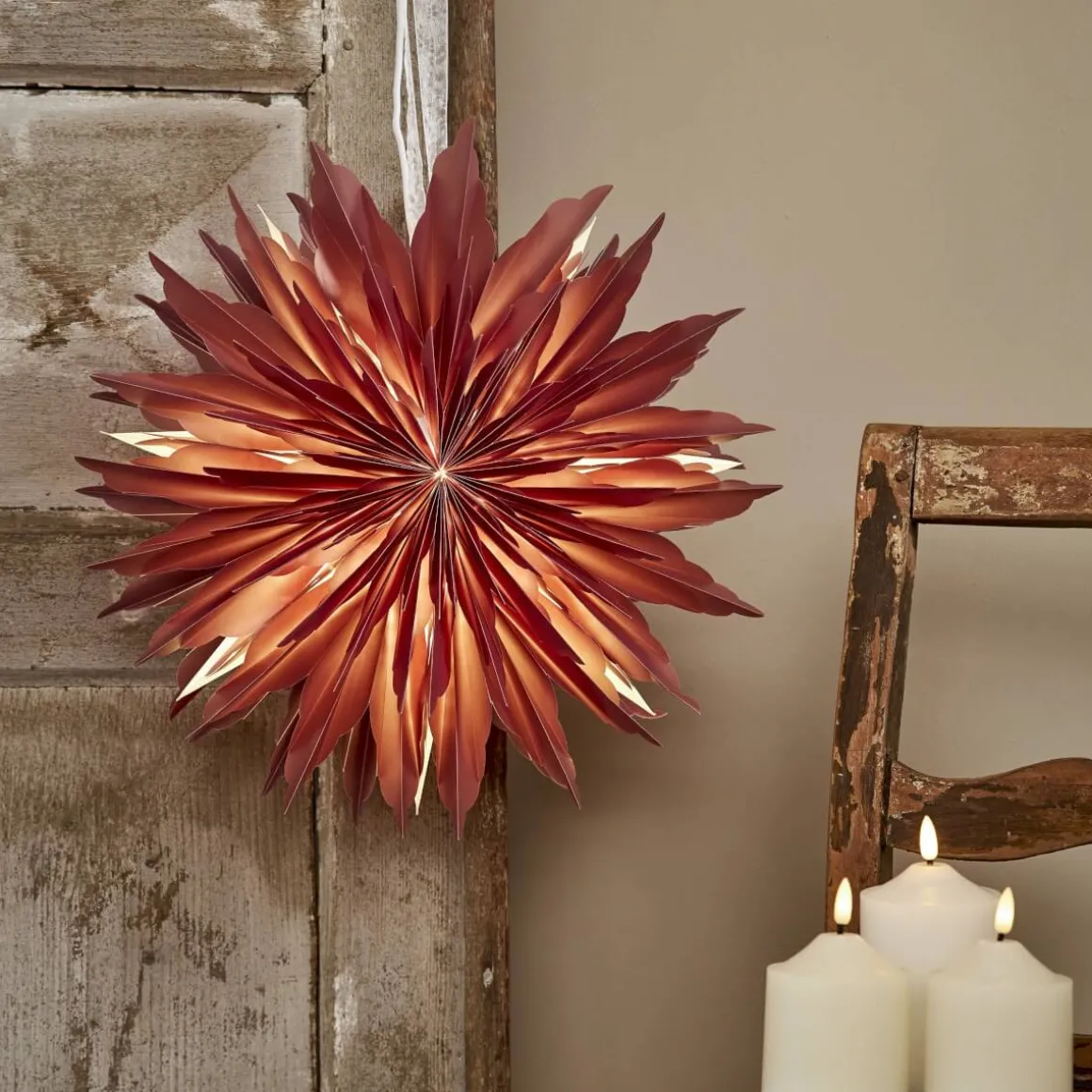 Wow wow wow så vacker och dekorativ stjärna i semitransparent rött papper som ger den en skir och lyxig känsla. Dis passar perfekt att hänga i fönstret eller varför inte mot en vägg för att skapa den där härliga julkänslan. Sladdställ och ljuskälla köpes separat.