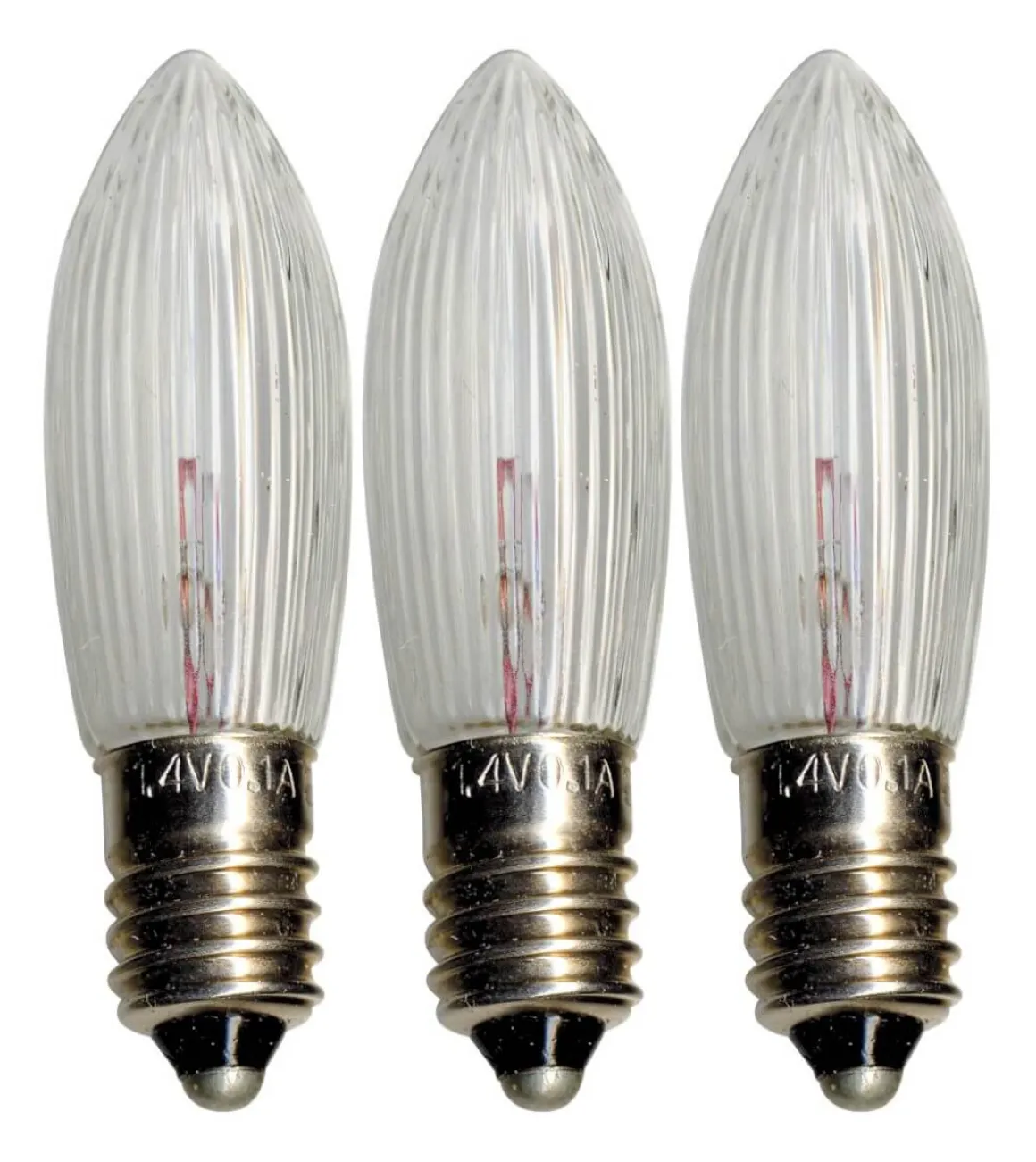 3-pack topplampor med E10 sockel 1,4 W och klart glas. Användningsområdet är inomhus.