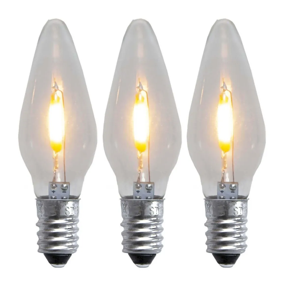 3-pack LED-reservlampor från Star Trading med klart glas och E10 sockel, 23-55V. Denna produkt passar till 4-10 armade ljusstakar. För inomhusbruk.