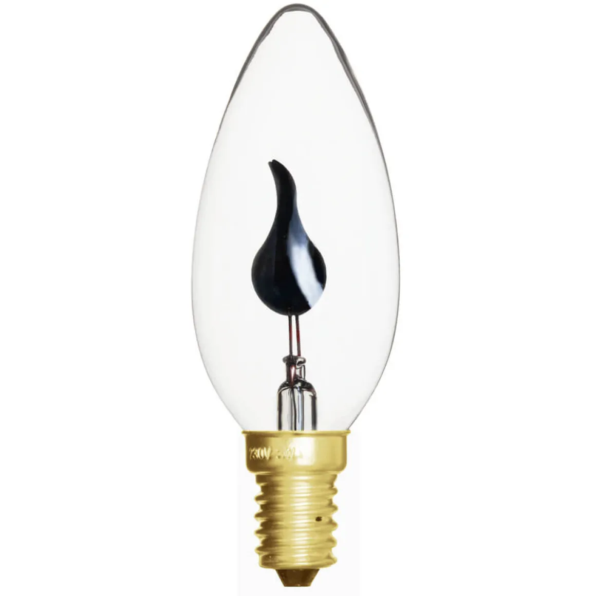 Dekorativ glödlampa där skenet liknar en eldsflamma. Inuti gashöljet sitter en liten låga som flammar. Lampan har E14-sockel och klar glaskropp.