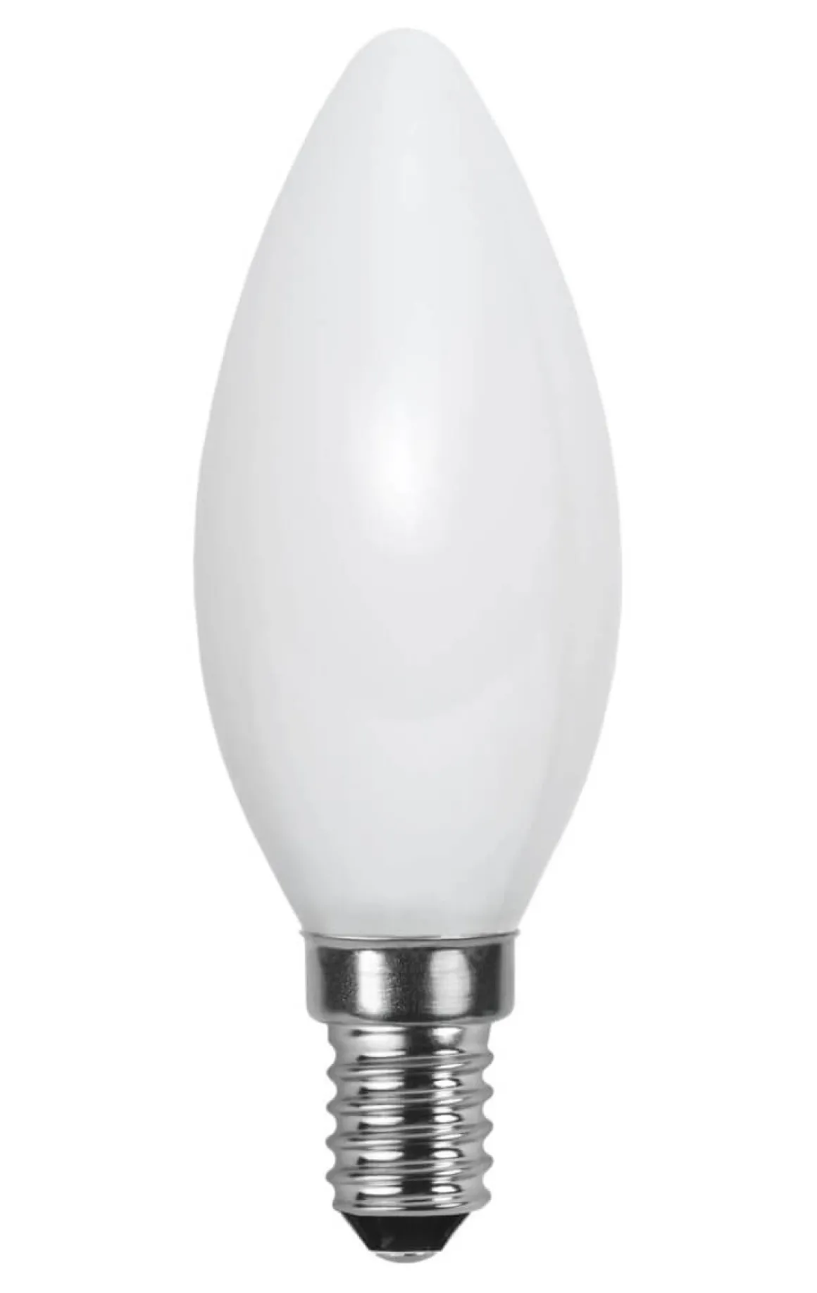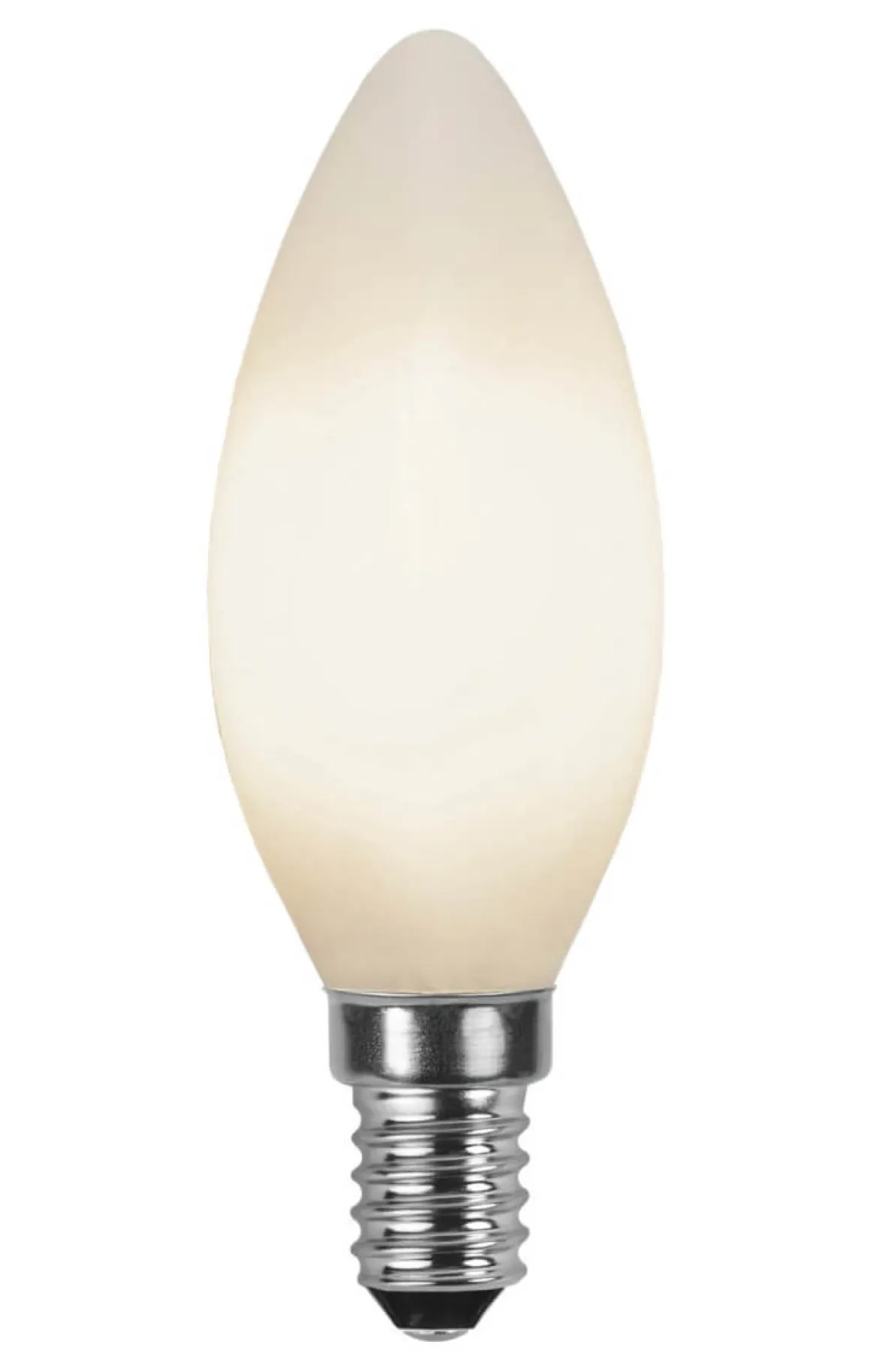 Helt opalvit LED lampa med hög färgåtergivning. Med en E14-sockel och varmvitt ljus på 2700K med ett ljusflöde på 150 lumen.