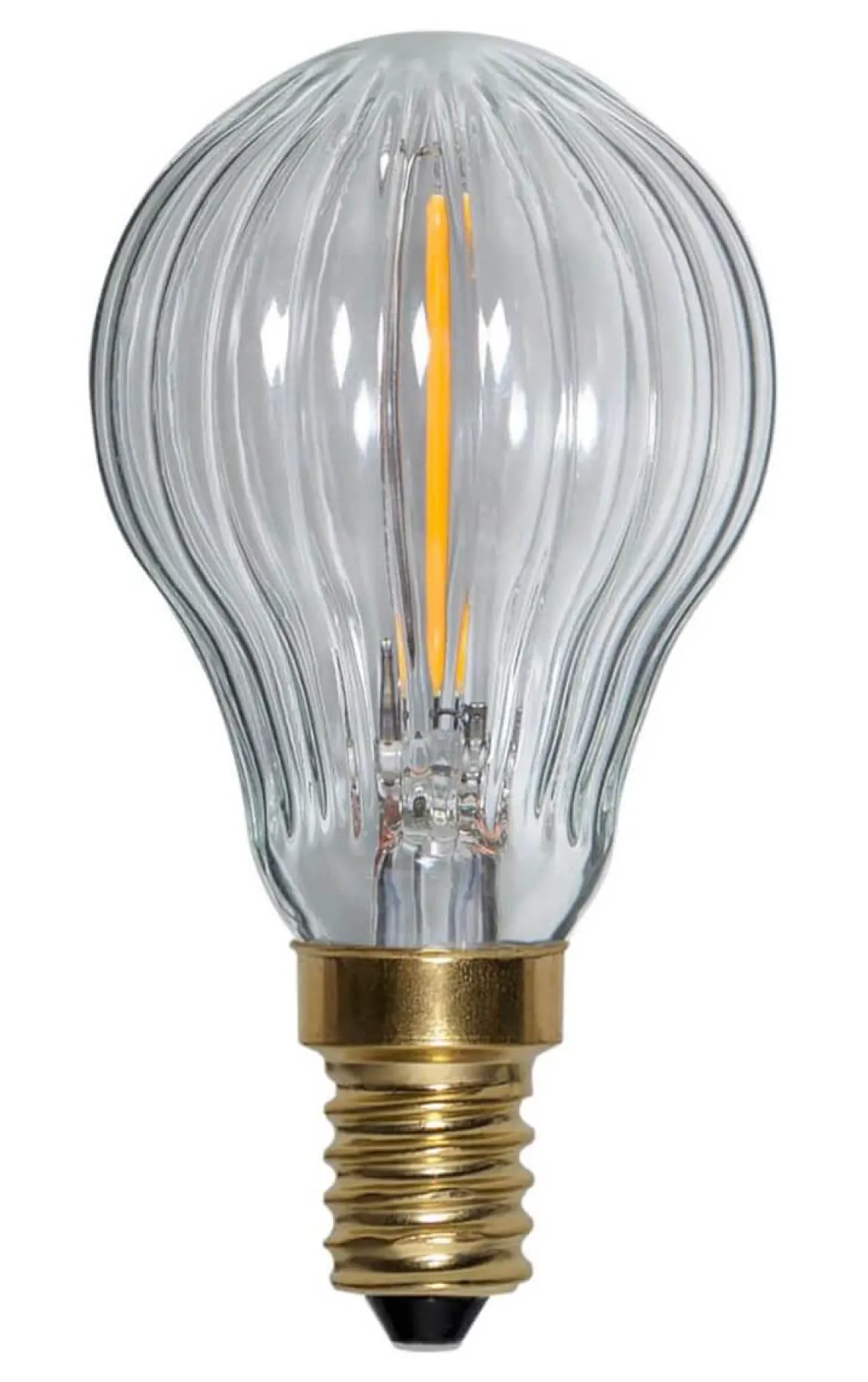 Decoration LED-lampa med varmt och mjukt sken. Färgtemperaturen är 2200K med ett ljusflöde på 50 lumen, den är dimmerkompatibel och har E14-sockel. Det räfflade glaset ger vackert ljussken.