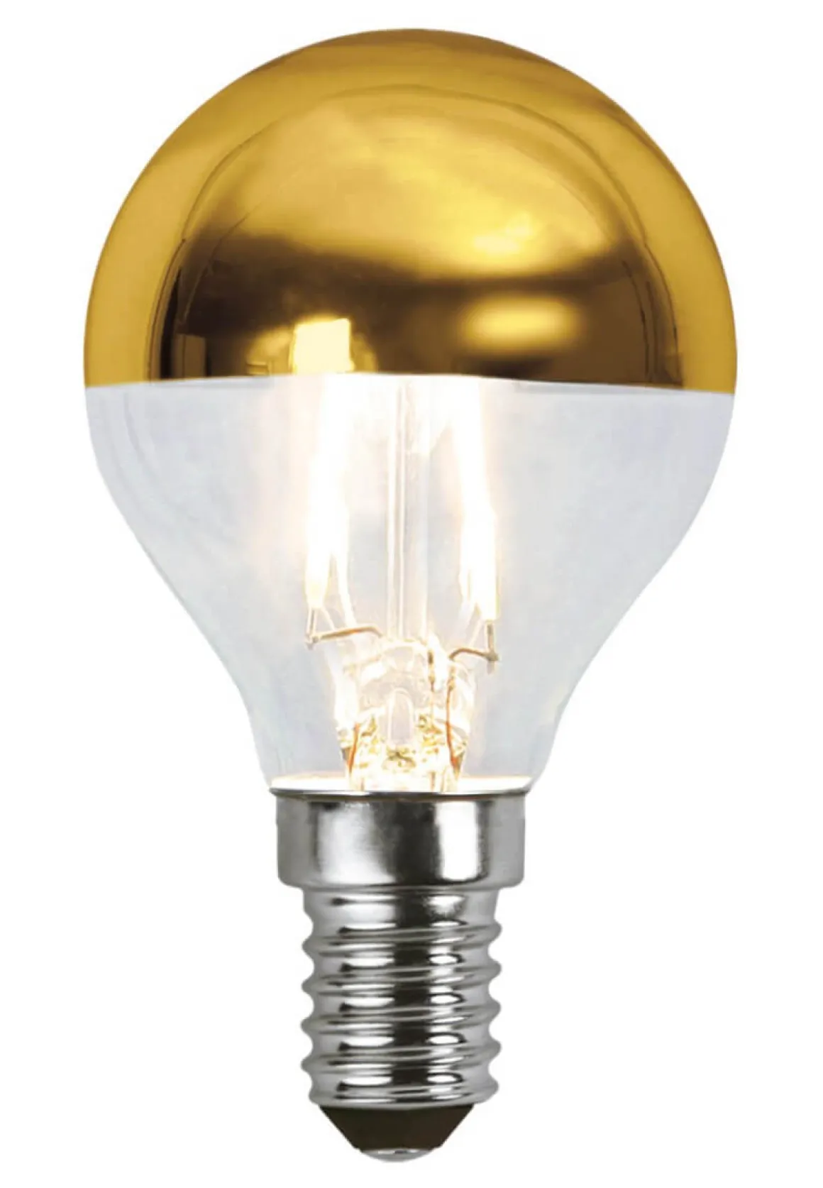 Toppförspeglad filament LED-lampa med E14-sockel. Färgtemperaturen är 2700k och ljusflödet är 180 lumen.