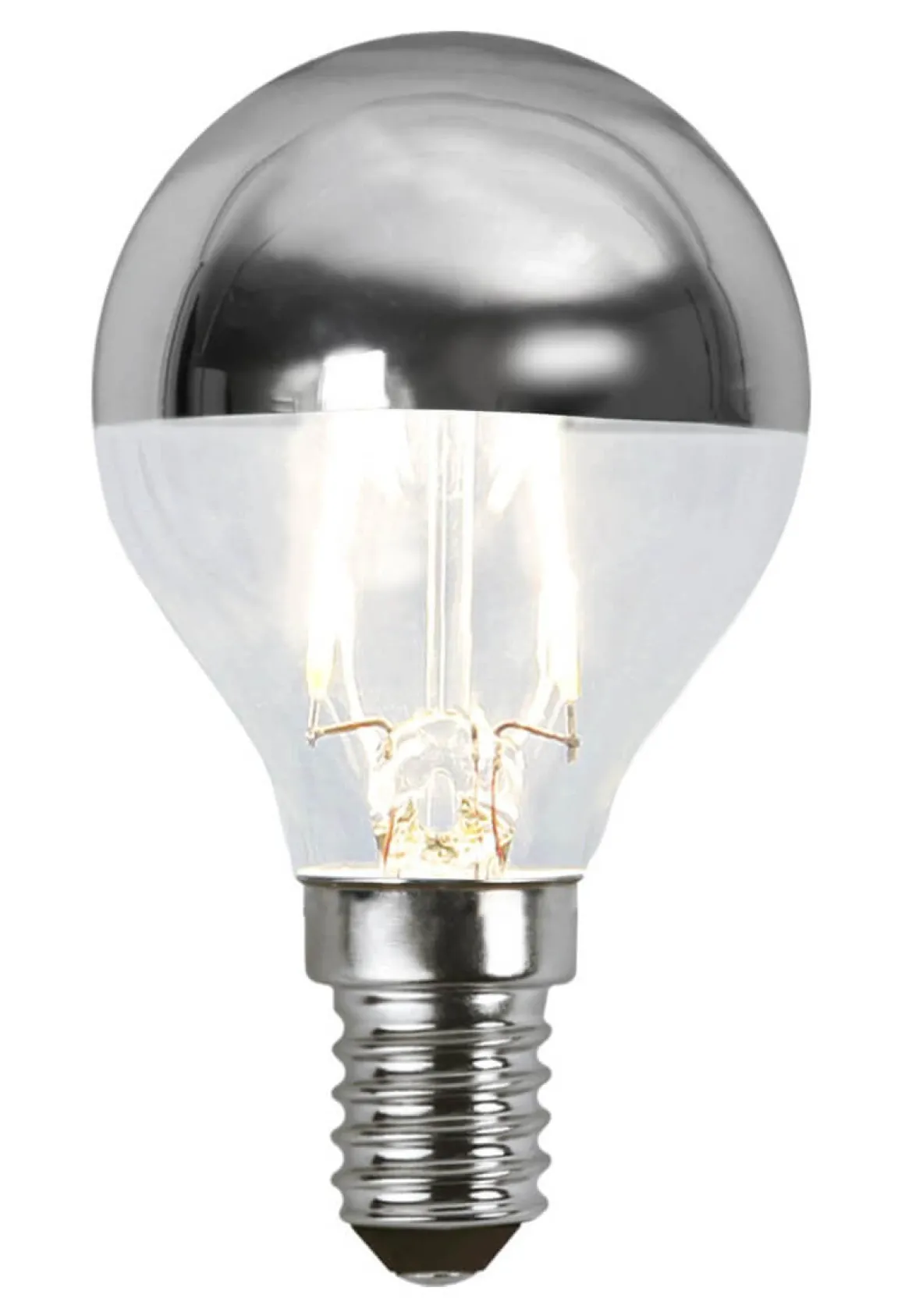 Toppförspeglad filament LED-lampa med E14-sockel. Färgtemperaturen är 2700k och ljusflödet är 250 lumen.