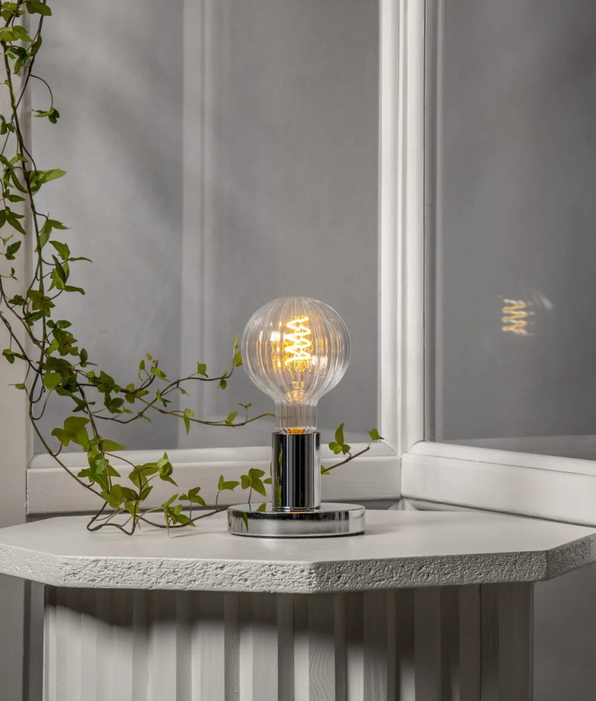 Läcker globlampa från Star Trading med klart mönstrat glas. Denna ljuskälla ger ett mysigt och varmt behagligt sken. Lämpar sig ypperligt som dekorationsbelysning och passar perfekt i ett enkelt upphäng, eller i lampfötter utan skärm. Hittar sin självklara plats över såväl soffbord, bardisk som över en matsalsmöbel.