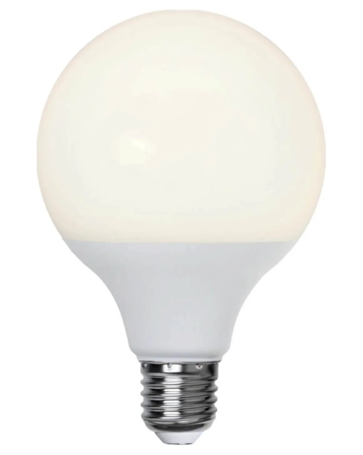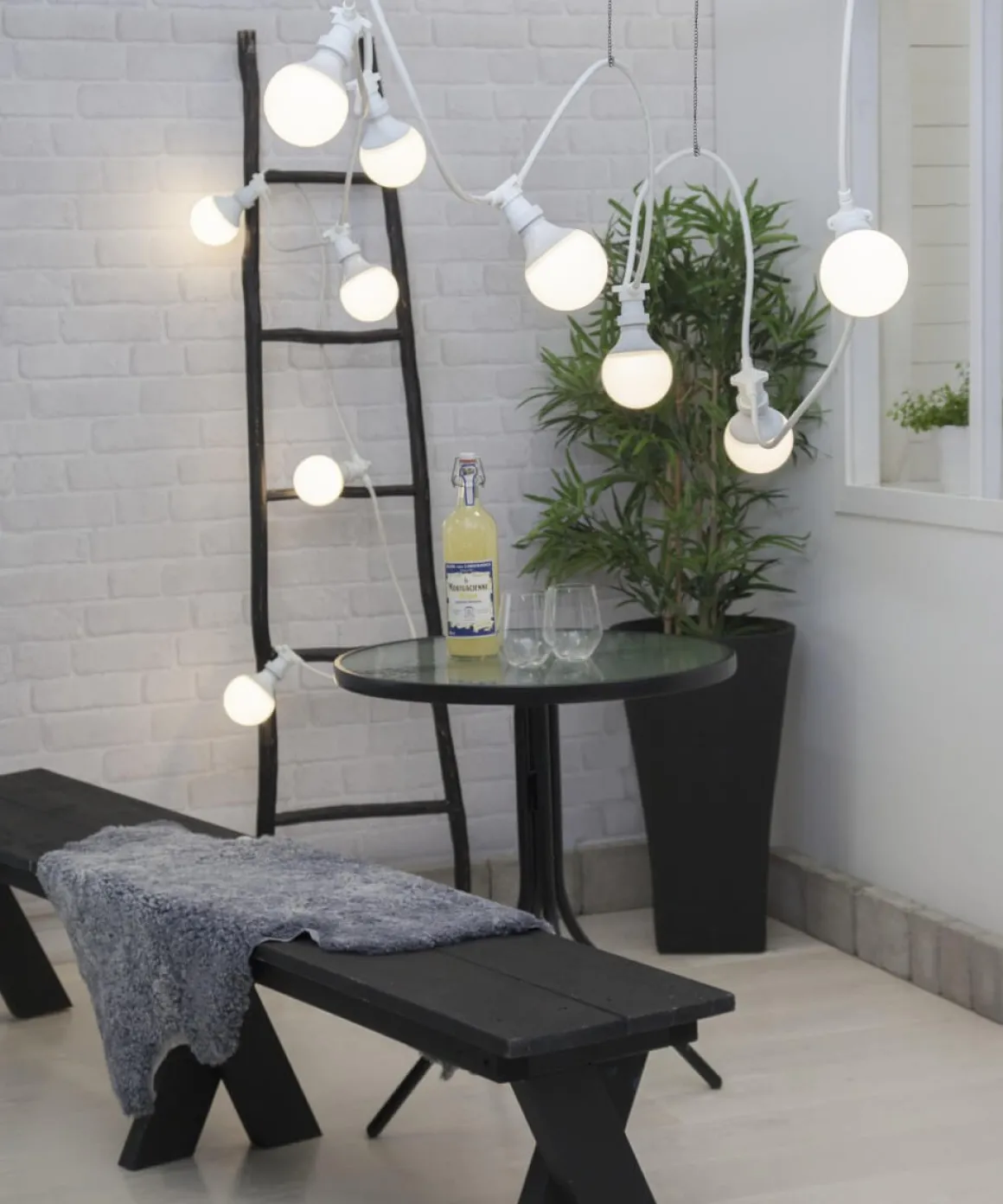 En LED lampa med plasthölje för att bättre tåla att sitta utomhus i en partyslinga till exempel.