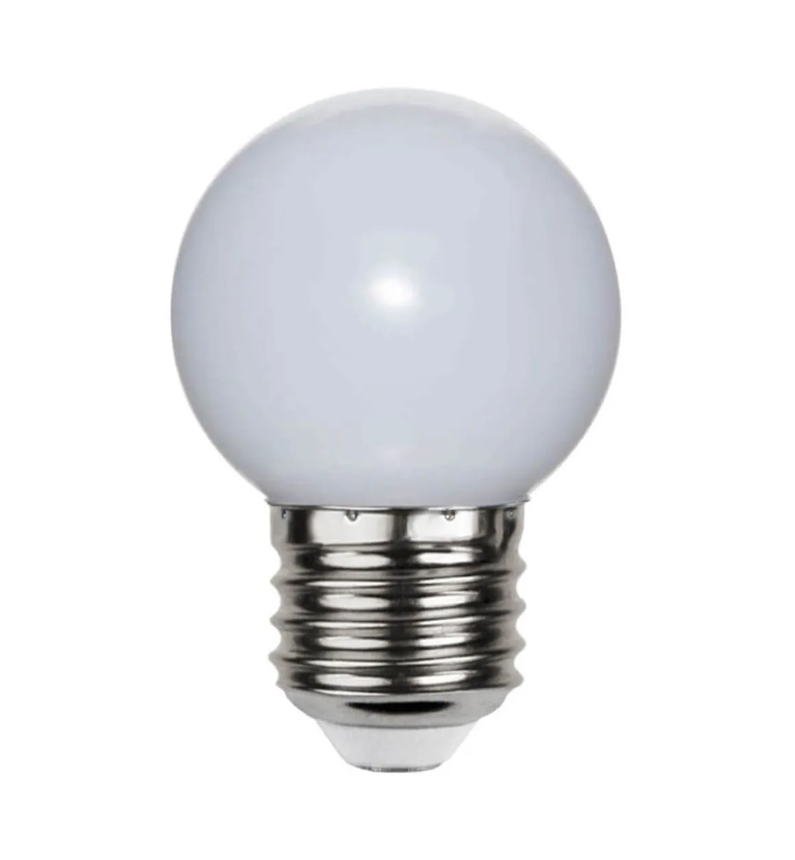 E27 LED klotlampa med en färgtemperatur på 2700K och endast 15 lumen passar hen bra i en partyslinga tex.