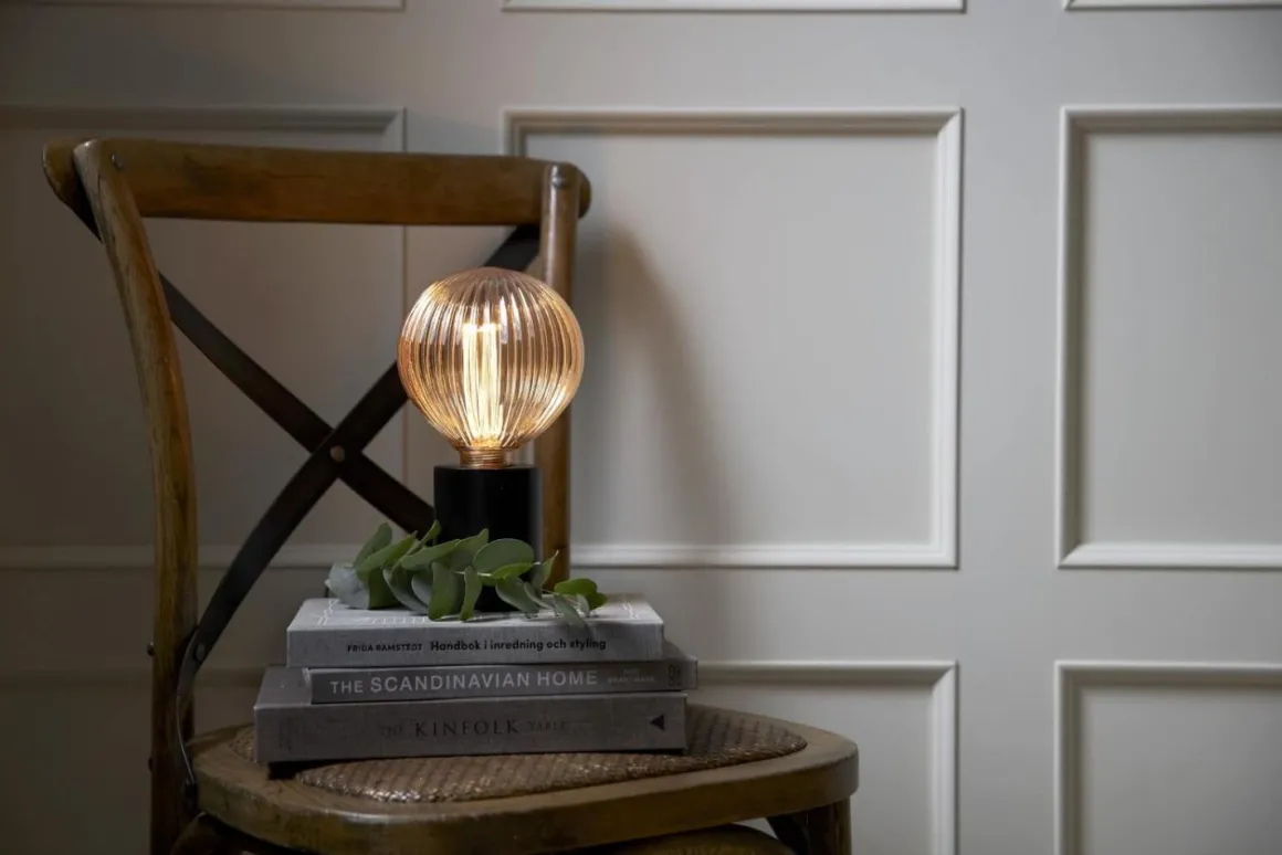 Läcker LED-lampa med amberfärgat mönstrat glas. Denna ljuskälla ger ett mysigt och varmt behagligt sken. Lämpar sig ypperligt som dekorationsbelysning och passar perfekt i ett enkelt upphäng, eller i lampfötter utan skärm. Hittar sin självklara plats över såväl soffbord, bardisk som över en matsalsmöbel.