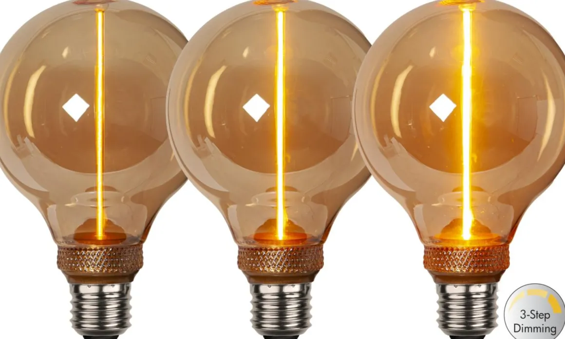 Amberfärgad ljuskälla av modell glob 95 från Star Trading med 3-stegs klickdimring! Ljusstyrkan ändrar du enkelt genom att slå av och på strömbrytaren. Välj mellan 20lm, 50lm eller 100lm. Ljusfärgen är 1800K och sockeln är E27. Minnesfunktion gör att ljuskällan startar på senast valda ljusstyrka.