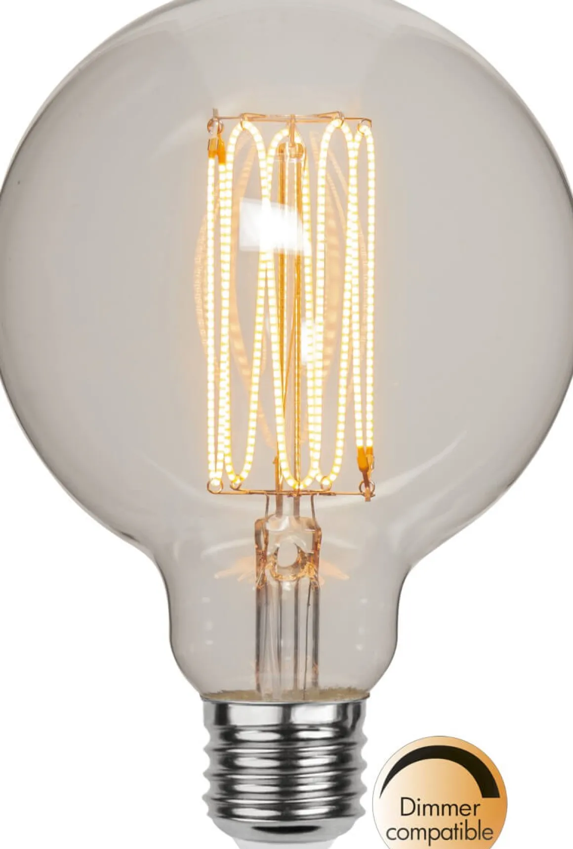Läcker E27 glob 95mm LED-lampa medklarglas från välkända Star Trading. Denna ljuskälla har ett extra tunt filament, endast 0.8 mm som ger ett mysigt och varmt behagligt sken. Passar ypperligt som dekorationsbelysning.Hittar lätt sin självklara plats över såväl soffbord, bardisk som i fönstret. Fin själv eller i ett arrangemang med olika modeller.