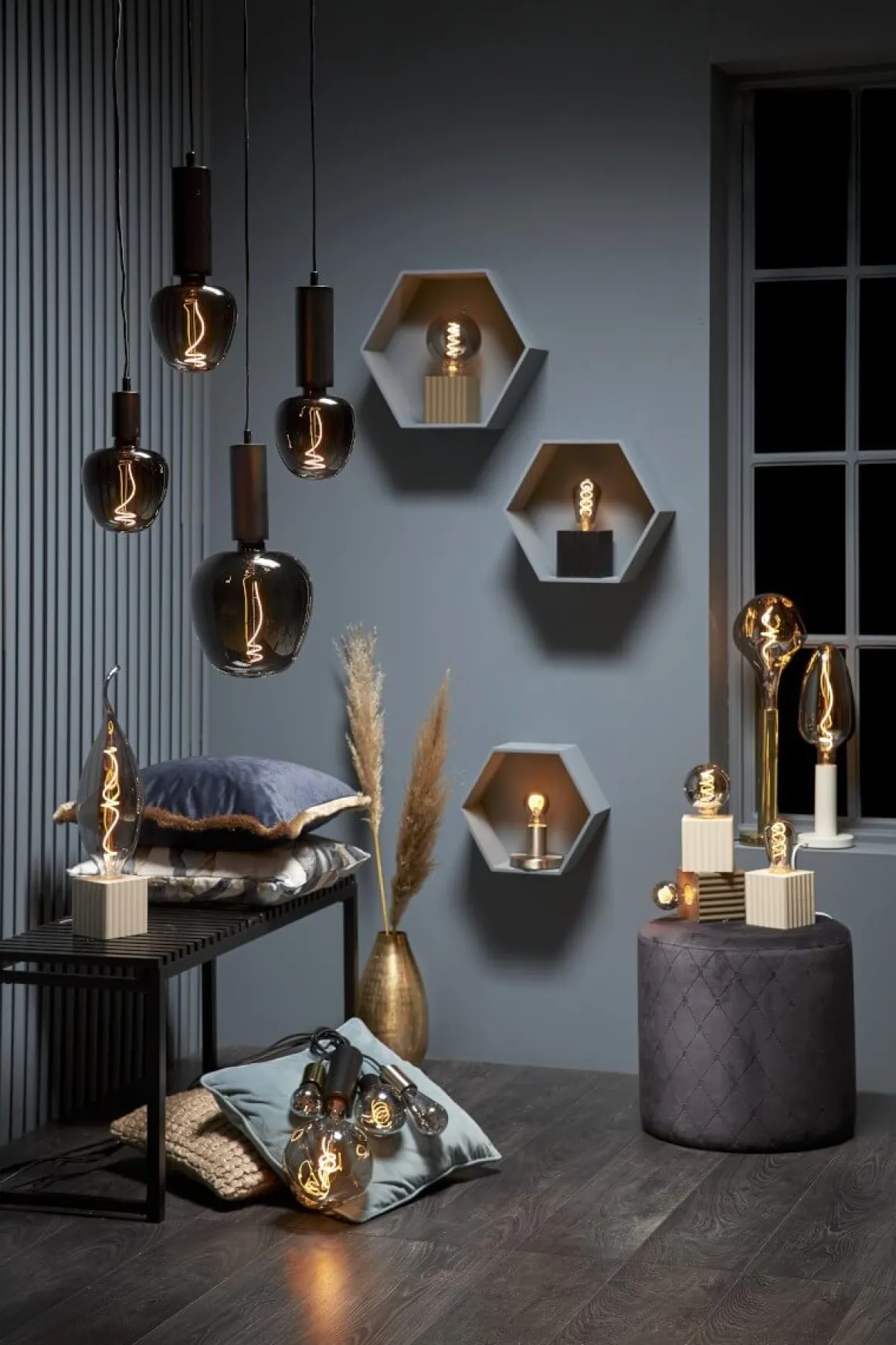 Dekoration LED-lampa med rökfärgat glas som ger ett varmt mjukt sken. Denna lampan är dimmerkompatibel och har en E27-sockel. #heavysmoke