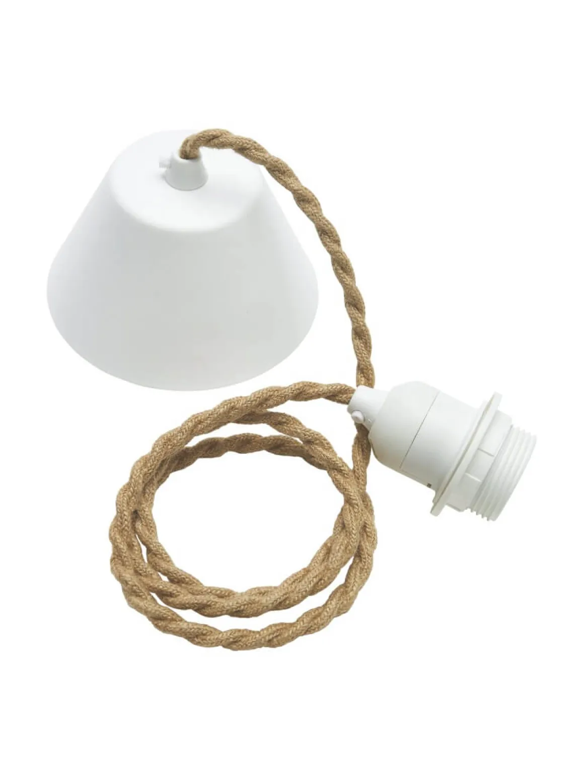 Takupphänge med jutefärgad tvinnad textilsladd från PR-Home 1,2m lång, vit E27 lamphållare med ringfäste, vit takkopp och en kopplingsplint. Takkontakt ingår ej.