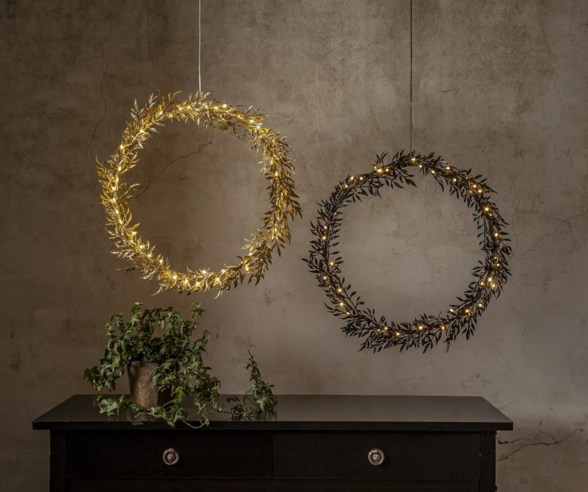 Lyxig guldfärgad julkrans från Star Trading att hänga mot en vägg eller i ett fönster. Kransen har guldglitriga löv som ger ett fylligt och glamoröst intryck. 50 små varmvita led ljuspunkter lyser stämningsfullt i kransen. Dekorera till jul eller vid andra festliga tillfällen.