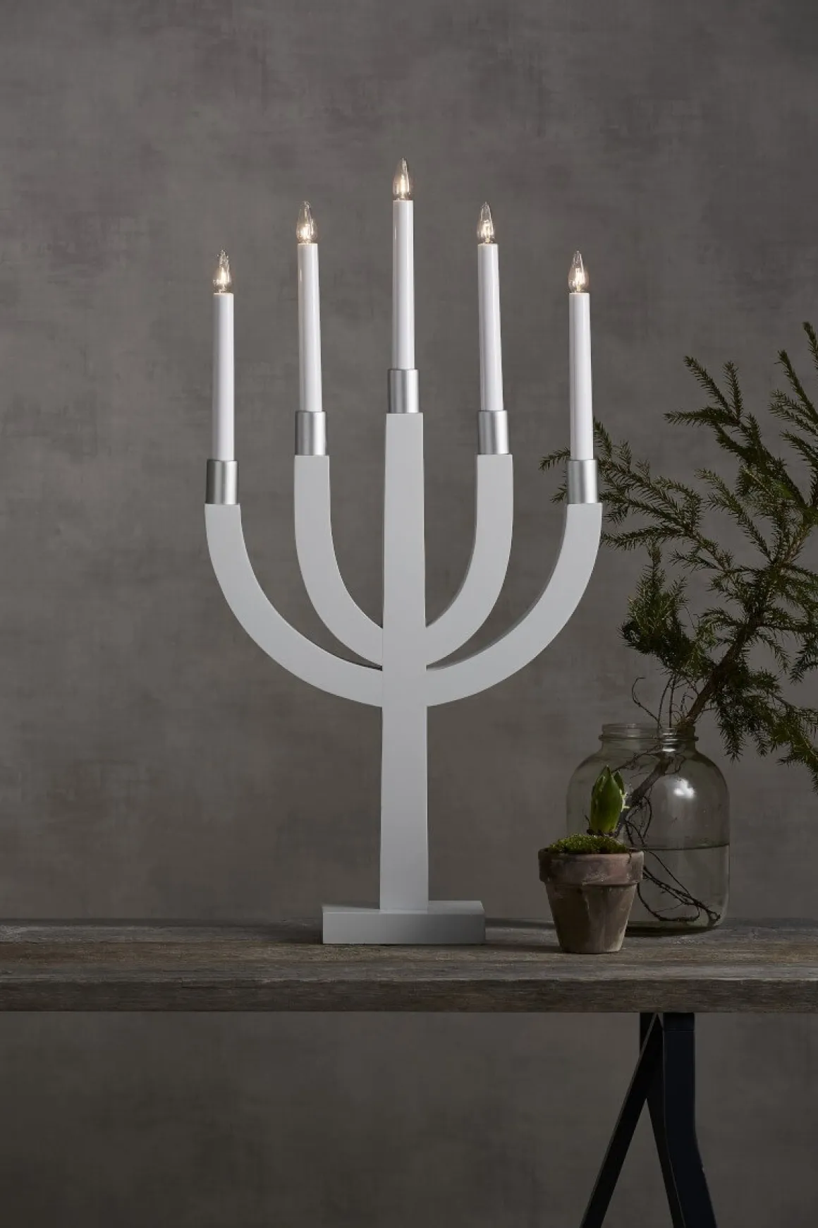 Stilren vit träljusstake med ljusmanschetter i silver och enkla former. Elias ger snabbt en härlig julstämning i ditt hem. Finns även i fler färger.