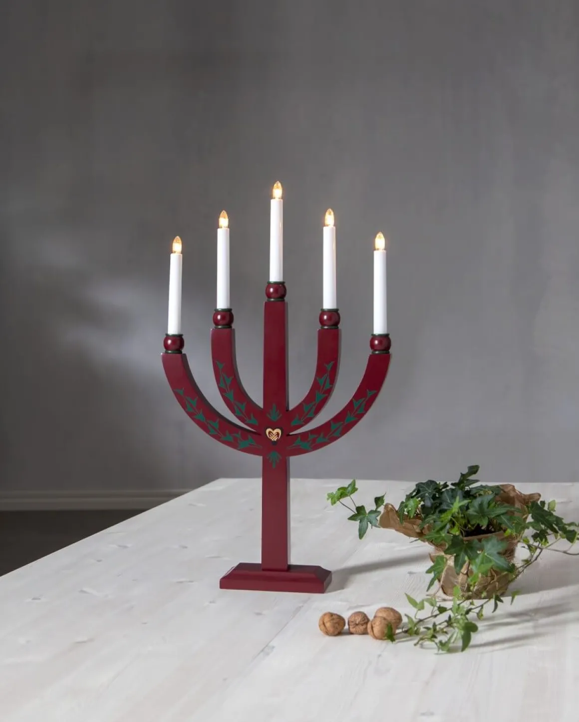 Stilren röd träljusstake med enkla former som har vart en stor kundfavorit i butiken i många år. Nu i ny design med vackert målade mönster längs med kroppen. Otroligt vackert!