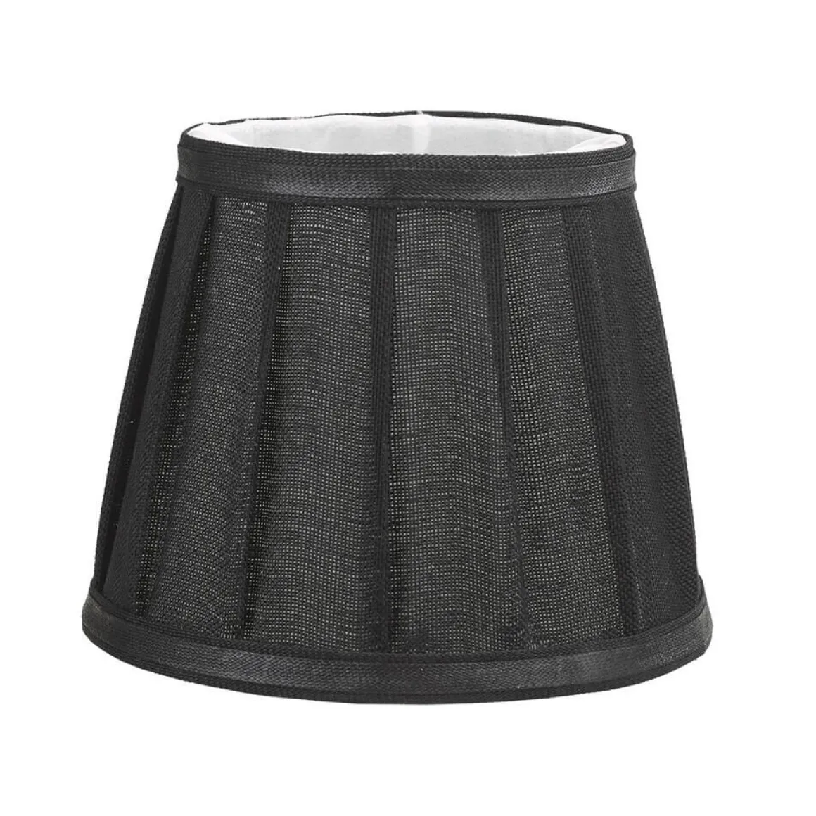 Svart fodrad svagt plisserad/veckad skärm med vit insida i Linnetyg från Oriva med klofäste. Emily finns i 3 storlekar, här ser du den minsta.