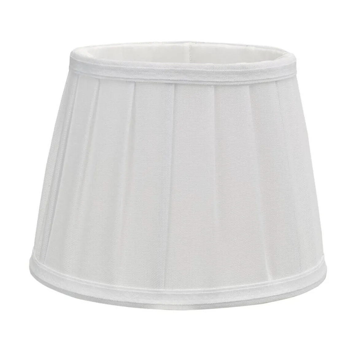Vit fodrad svagt plisserad/veckad skärm med vit insida i Linnetyg från Oriva med klofäste. Emily finns i 3 storlekar, här ser du den mellersta.