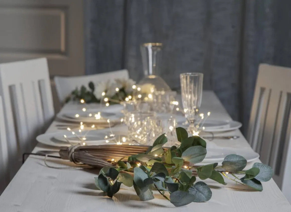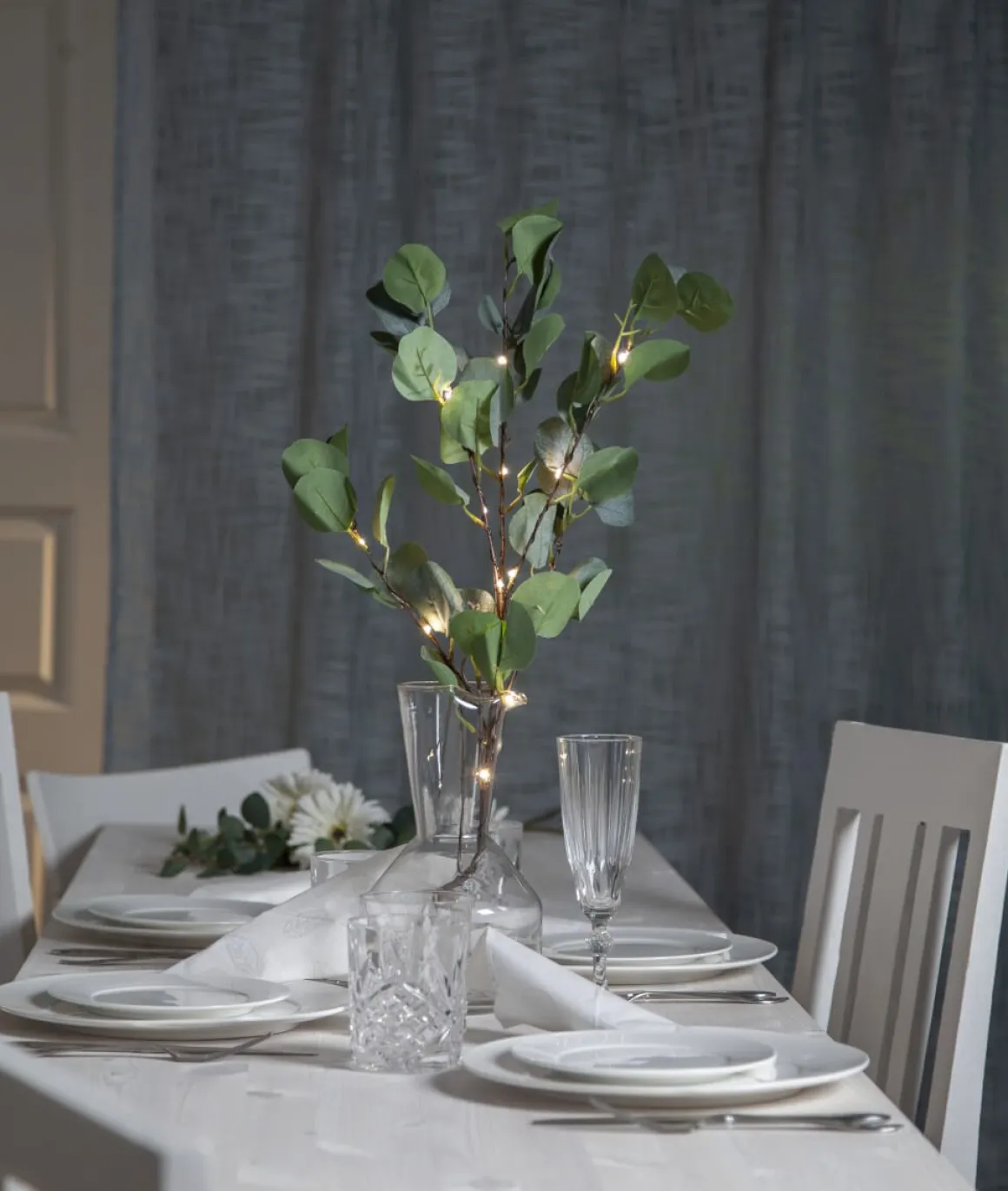Dekorationskvist i Eucalyptus med 15 stycken små varmvita dioder vackert invävda bland bladen. Drivs med batteri och har självklart en inbyggd timer så du enkelt kan bestämma när du vill att den ska lysa.